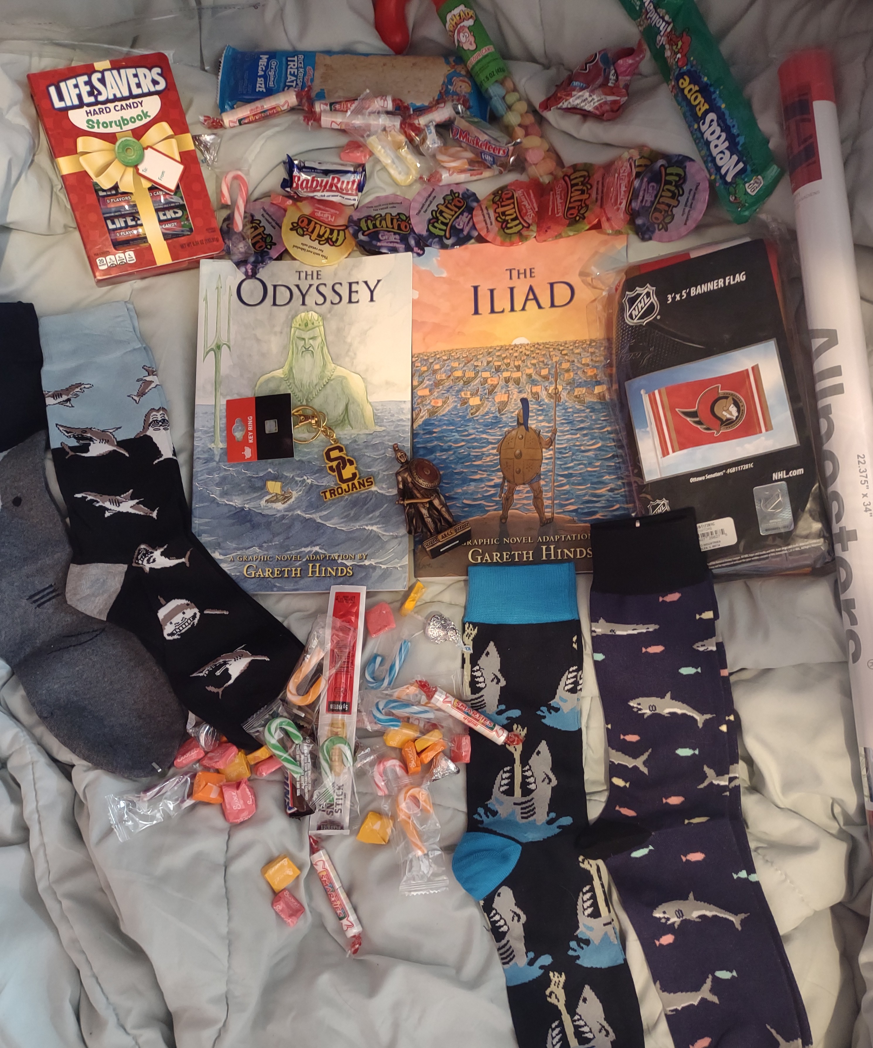>>83481967Yes, my USC shirt is still on its way, but here's everything I have. >Lots of candy and snacks>USC keychain >Shark socks>The iliad graphic novel >The Odyssey graphic novel >Ares statue >Montreal Canadiens poster >Ottawa Senators banner