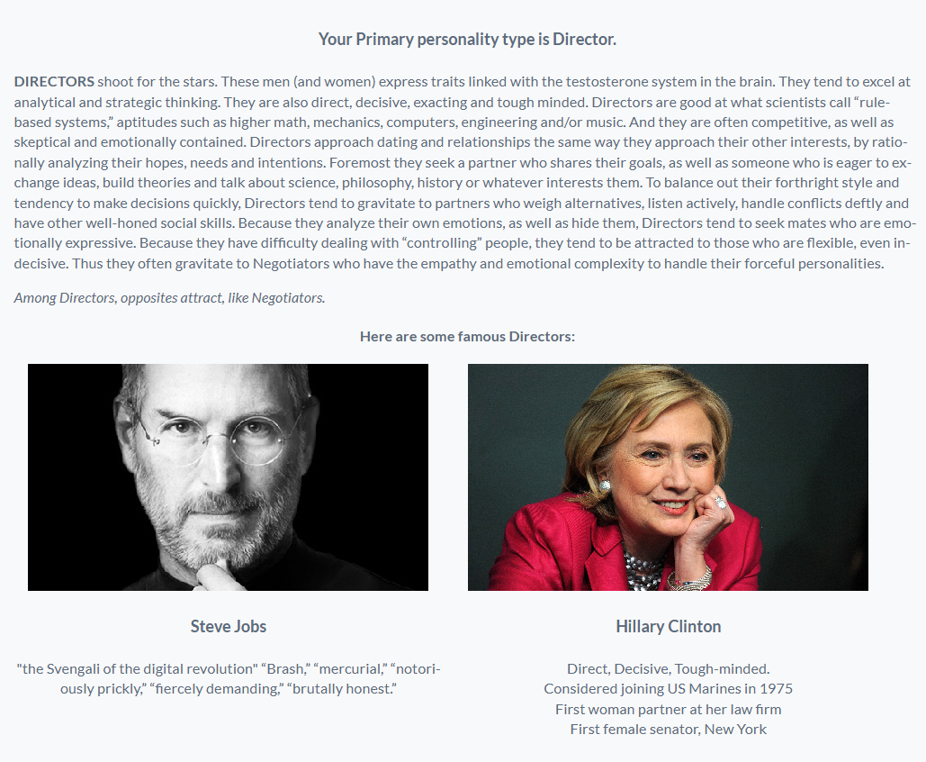 >>83483073>https://theanatomyoflove.com/relationship-quizzes/helen-fishers-personality-test/personality-test-1/Turns out I'm just like hill dog