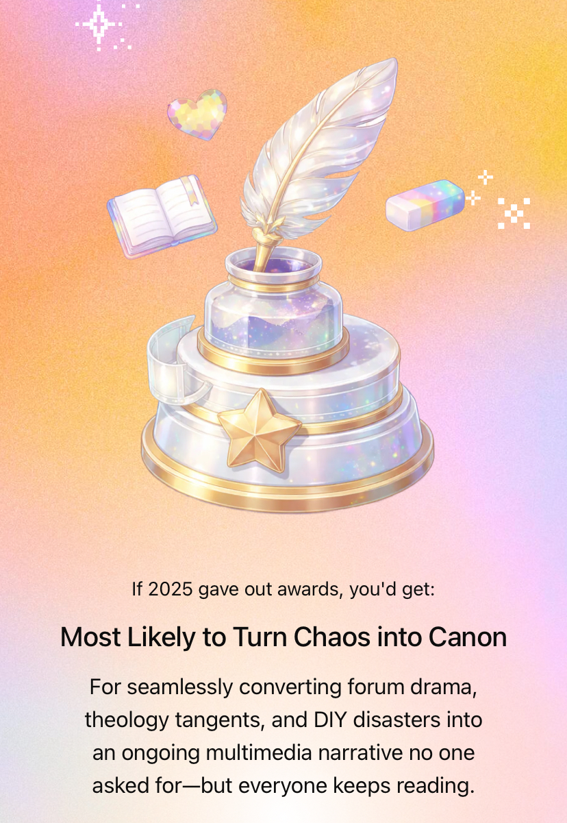 >>83483637I was also in the top 3%, and got the same archetype! I have a feeling it's because we have to use a lot of hypothetical language to get around ToS so it interprets us as "planners" and "conceptualists" over "doers". The "Em Dashes Exchanged" counter made me giggle, too.Did you get a trophy?
