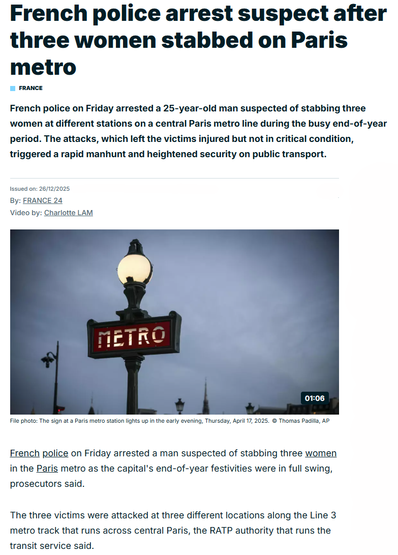 >>83497760>France's Interior Ministry said in a statement cited by the French AFP news agency that the suspect is a 25-year-old Malian national known to the police. He was imprisoned in 2024 for aggravated theft and sexual assault convictions.What a surprise. It's exactly who you'd expect