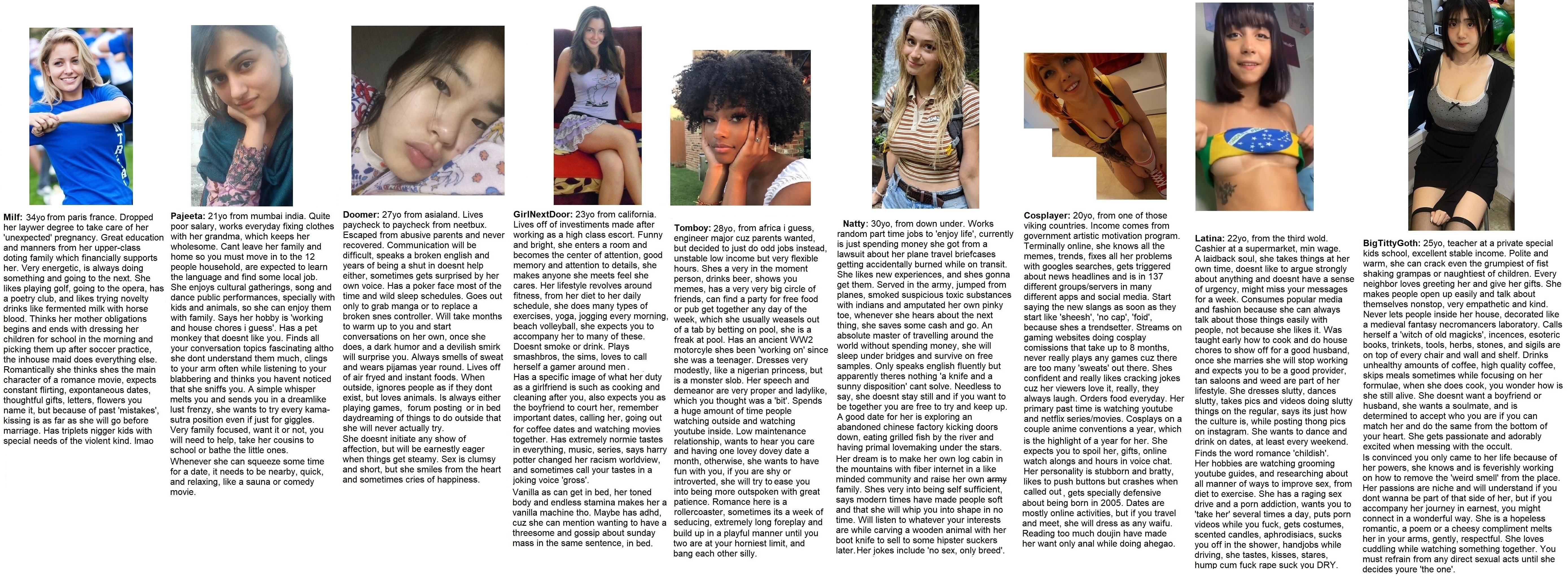 >>83503086Oooof quite hard to pick between the goth girl, tomboy, and the Indian girl. Indian girl would probably not work unfortunately, because I don't want to live in a big household. Tomboy is nice but is a bit too extraverted for my taste, although it doesn't seem like she's a turbonormie with the interests she has. Goth girl is my kind of relationship. I'd gladly wait until we're certain we're meant for each other. It's how I think relationships should be. I hope she's not too mentally ill though, being that into the occult. I do wonder about the spiritual world every now and then, but not like that.