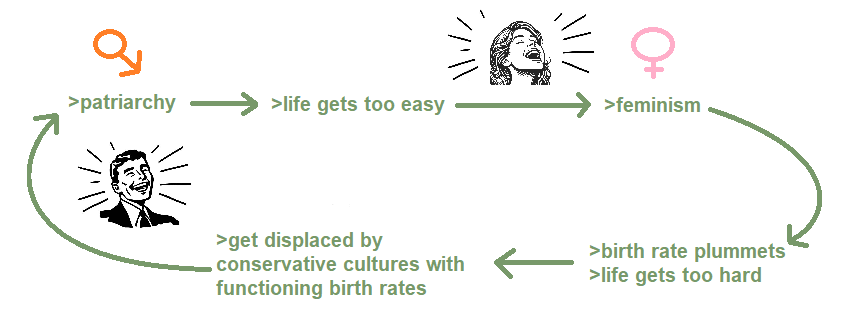 Feminism was really about sex and the most realistically attainable ideal environment for female sexual strategy is a polygamous one:>be women, under patriarchy>Mr. Tall, Dark, and Handsome walks by>he got married young, like you>very difficult fuck him for his superior Chad seed because (1) the traditional cultural values of propriety he was inculcated with growing up (2) divorce from his current wife and marriage to you would be heavily scandalized and frowned upon (3) you'd still have to convince him you're attractive enough and worth it to risk cheating and potentially having a bastard child after the previous 2 barriers and (4) contraceptive options are still mediocre at this point in history>alpha part of the "alpha fucks, beta bucks" strategy goes unfulfilled and you're annoyed you have to carry some beta provider's mediocre seedBut then,>feminism comes in>have a sexual revolution in the 60s>sex becomes more liberal, casual, and unstigmatized, and slut culture minimizes >because men don't exist in a vacuum, behaviorally, we're naturally brought down lower along with women>hookup culture evolves on the backdrop of the sexual revolution>Mr. Tall, Dark, and Handsome walks by again>this time he's single or effectively single, open-minded about sex, and willing to fuck and cheat on any bitch to enjoy his red-blooded youth and new experiences>Chad seed successfully secured in only 1 nightJust like patriarchy, feminism was also underlain by sex. Men don't necessarily want to subjugate women, we just want to fuck them, and because most women don't want to fuck most men, patriarchy was the answer to that problem that still preserved society and the sex-for-a-job social contract between man and civilization where man agreed to civilize himself and cooperate in exchange for guaranteed pussy. Feminism completely erases this just to get pumped-and-dumped by Chad. But ironically, it all comes back full circle.