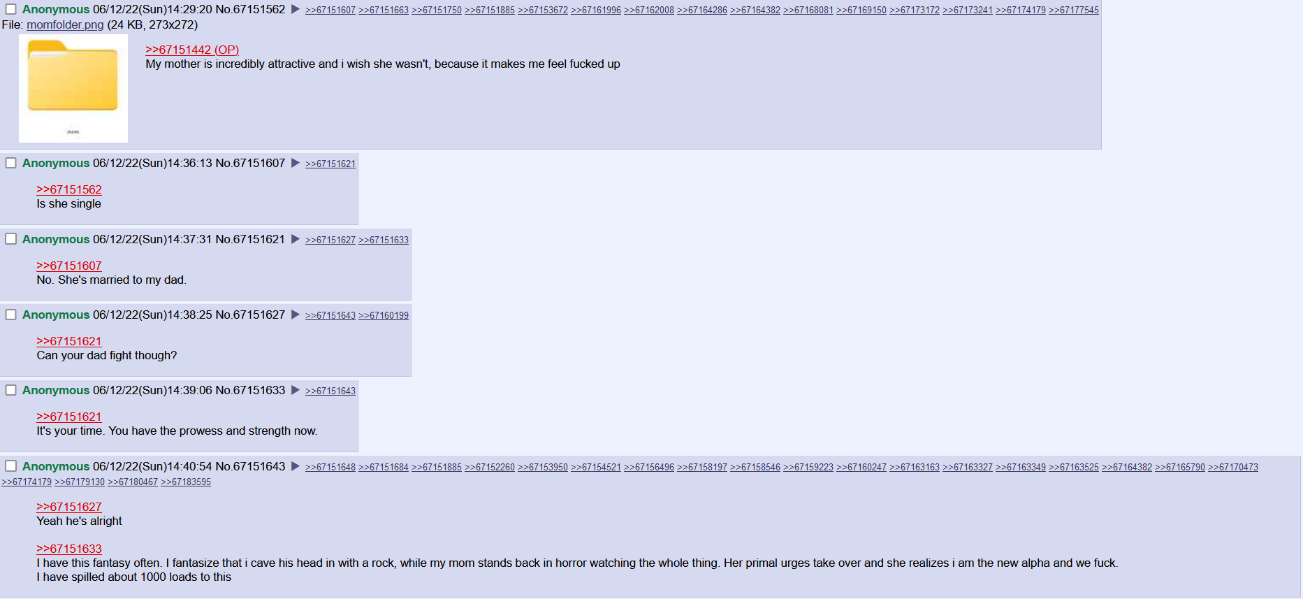 There's a concerning amount of posts here coming up with plans for people to rape their moms. What the fuck.