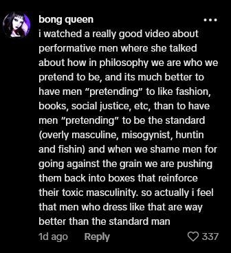>>83527212That's just a moronic take in general. Every punitive law in existence knows that a liar, cheat or a person who is generally treacherous is more dangerous than a person who simply makes no secret of their malicious intent. In hiding non-performance-favorable attributes, the male is more dangerous, he shows that he recognizes the tastes of the opposite gender and is willing to go so far as to instrumentalize them to get with a woman. Hypermasculine tate bros are out of touch and maybe a bit psychopathic, yet they are unapologetic and embody the idea of the reactionary anti-establishment; he is disingenuous only insofar as he hides certain fears and weaknesses behind a facade, recognizing, especially in this day and age, that his "performance" is merely for him, as the opposite gender on average dislikes his persona. The performative "leftist" leftoid is by nature disingenuous and benefits himself in a shallow way: To get with a woman, by playing a woman. He'll humiliate himself and recognize a (hypothetical) "dumb male type" he doesn't belong to, creating a common enemy that is always at the forefront of each behaviour. He will read feminist literature, not understand it and let the female think "well, at least he is better than those hat don't read it". Is he really? Is the caveman or barbarian the true demon, never having heard the name of Christ, having lived a life of savagery, yet also animalistic balance, having adapted a general respect for other living beings and the world he lives in; or is it the fake Christian, who has read the gospel, only to misuse it, twist its words and do anything but live by it?