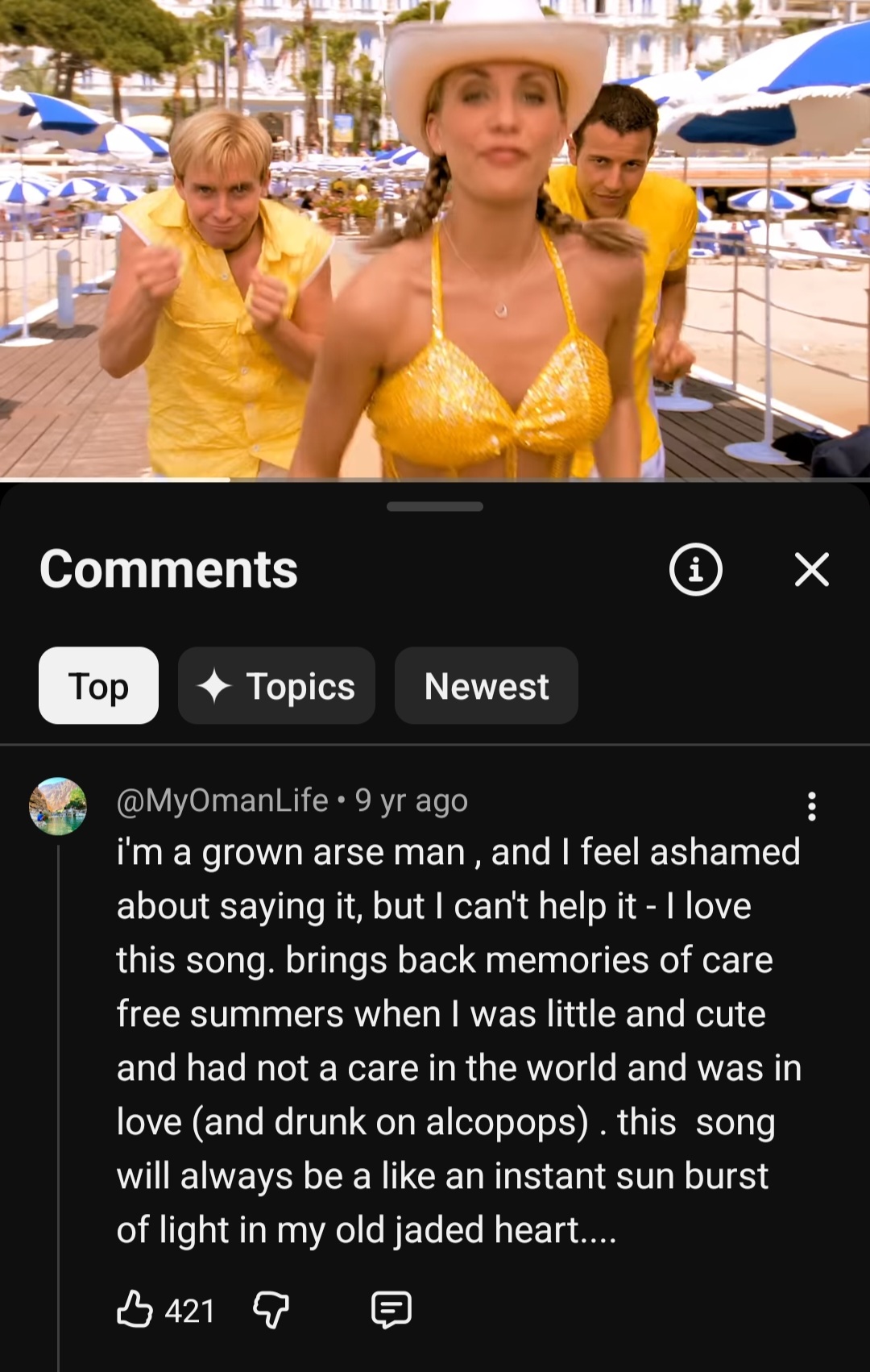>>83567295https://www.youtube.com/watch?v=y-QMwcVKpxg>I love this song, brings back memories of care free summers when i was littleState