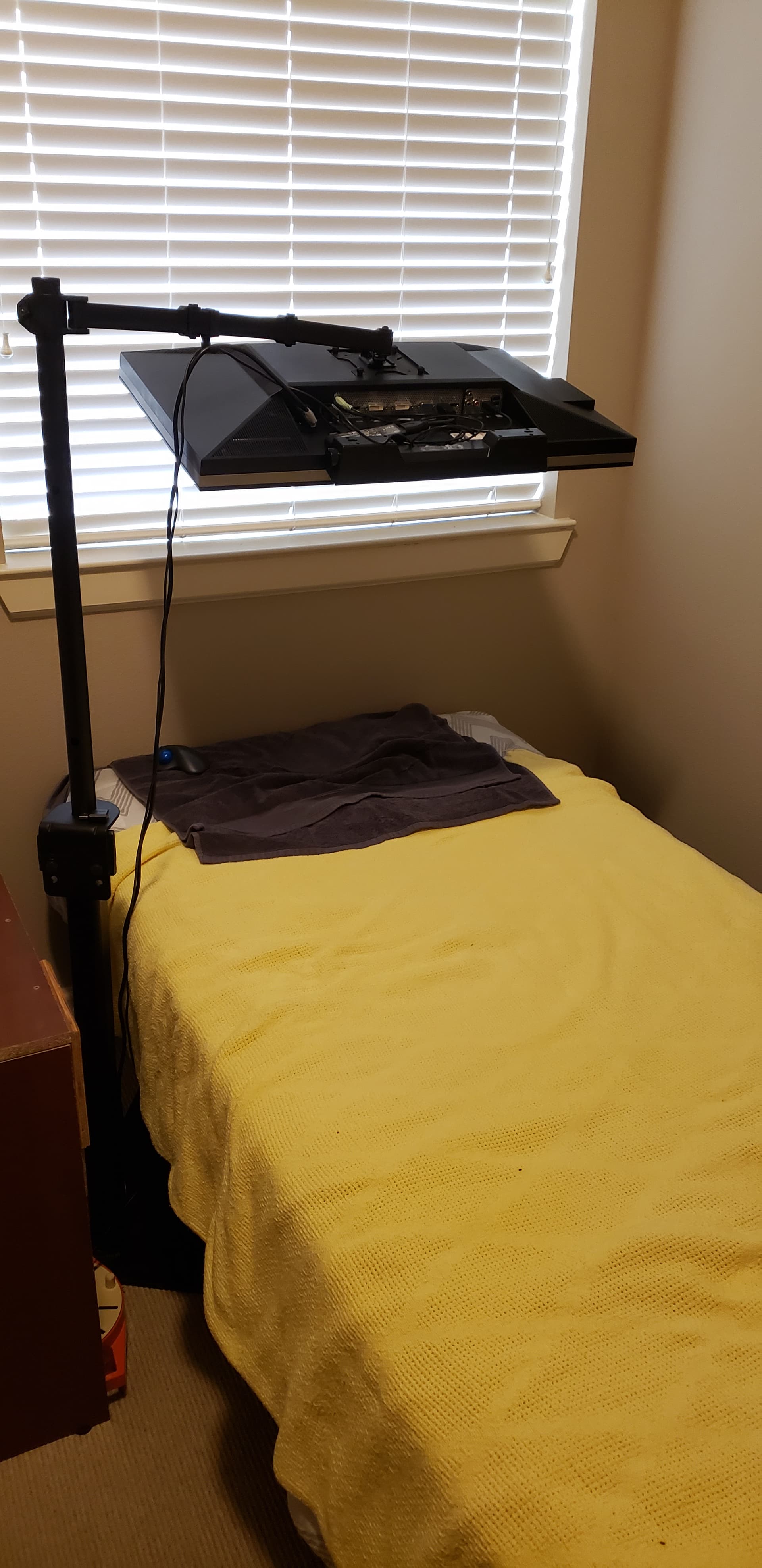 >>83572454you see a lot of those NEET battlestations where lads suspend their monitors above their beds like picrel.but i'm sorry, no matter how secure it is, some part of your brain MUST worry: "this is going to fall in my face some day."
