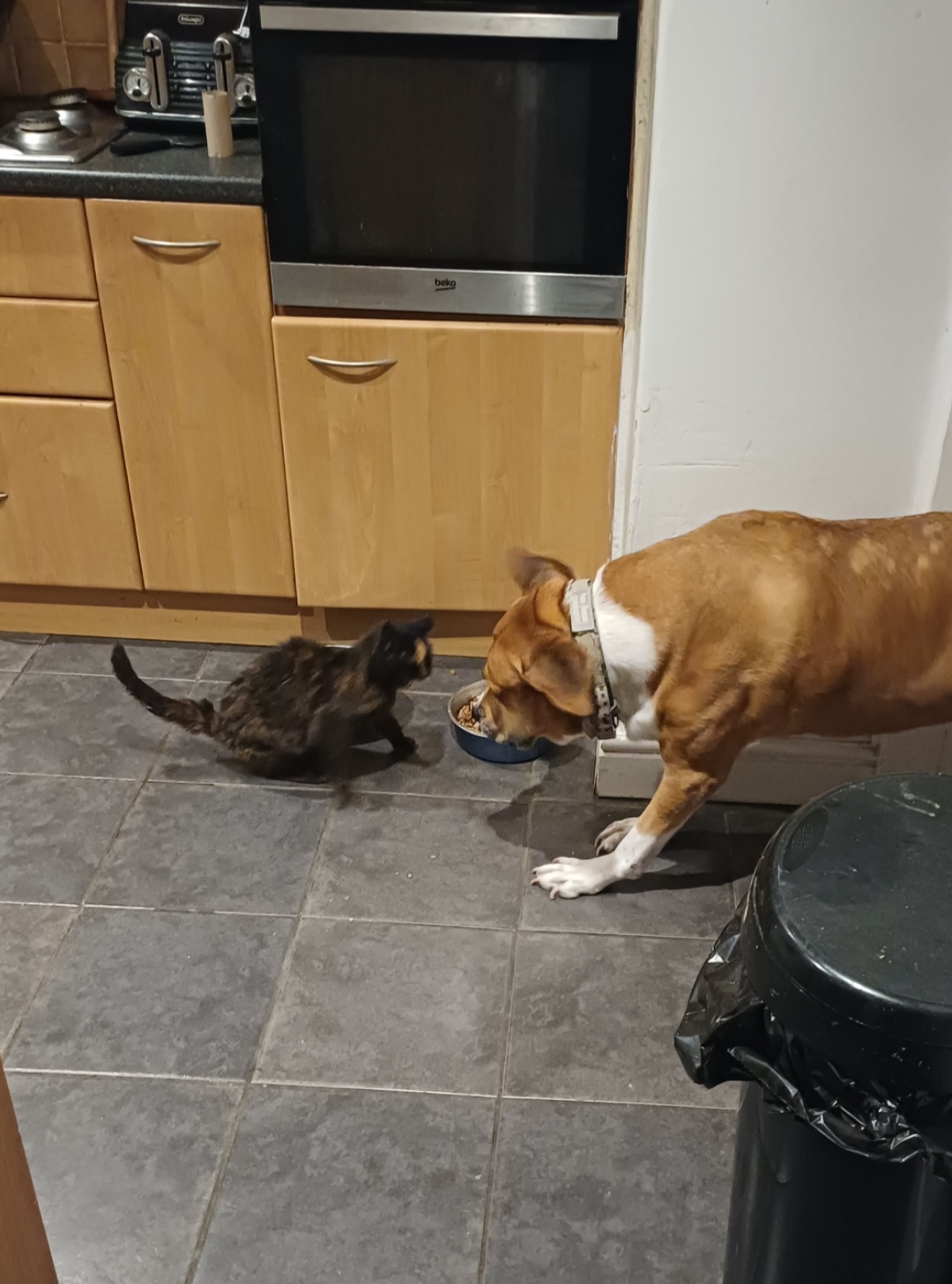 Corr, battle of the bowl, snarf doesn't give a fuck. She was eating pedro's food, again. She loves it.Perfectly timed picture.
