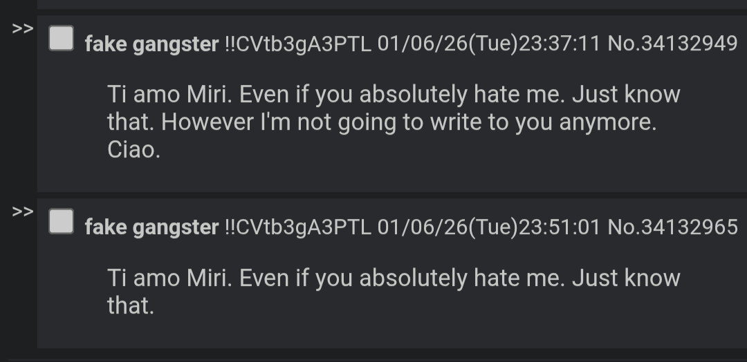 >>34140833 #I told you my words mean more than any others and you hear them from me more than anyone else. They're from me, only me, and to you, only you. Look at attached and things will clear up here as you understand where worth truly isI know there are parts of my letter that really reverberate and help us like that(Giving each other the same hurt and a bit more)The rest of my letter you can view by looking at my trip posts here. I do love you Maria.>>83610484 #>It's never surprising to find that Maria and I are the same. The same reaction, the same needing the other to feel just as much (plus a bit more). Same pride, same righteousness, it's not really those but why moments but more of course moments.>What we have with each other is different than what anyone else has.>I understand and I promise it's going to be okay