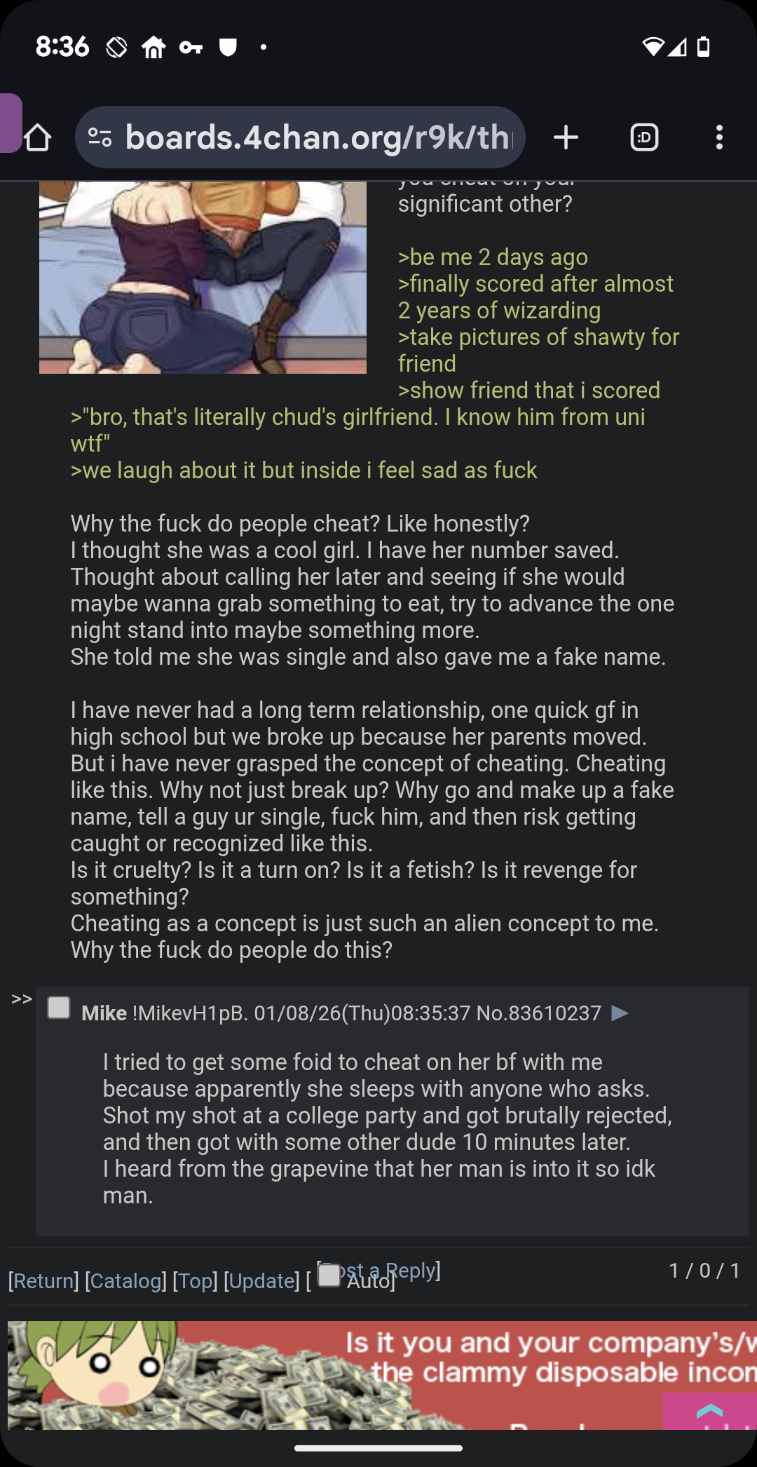 >>83627944Yeah I can't delete them I never do when this happens with someone I thought had something special with , this is the third time and pushing 30+ I'm not seeing a fourth.I don't know what happened, hard to tell when we just had a talk about communicating better.Only to find myself and my messages ignored, ghosted and eventually blocked.With all the time I spent worrying if she might had an accident or an emergency.To this day it feels so surreal, I can't shake that feeling off, we shared so much together, spent so much time building what we had.Just to be over in a single night without any words from her side.I'm jealous of things she disliked , pointing out walls of text about every flaw.