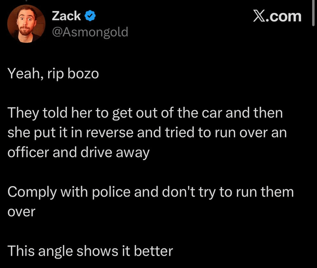 >>83609448It's sort of crazy how easy it is to convince people of demonstrable untruths. >>83609469Is it though? She was purposefully blocking the road to impede armed federal agents carrying out their lawful duty. She was told to leave, she didn't, she was told again, she didn't, she was told by a senior officer, she didn't. Eventually they decided that they would remove her from her vehicle, as they are perfectly legally allowed to do and by all accounts is the next reasonable action in escalation when someone refuses to comply. They tried to open her door to remove her, she backed her SUV up. They told her to turn off the vehicle and get out, she didn't. An officer moved in front of her car to dissuade her from moving. She decided to accelerate into the officer. The officer didn't draw his gun until the car started moving towards him. When the car didn't stop and made contact he opened fire. She was killed by his firing.I don't really know what the 'somewhere in the middle' is for this situation.