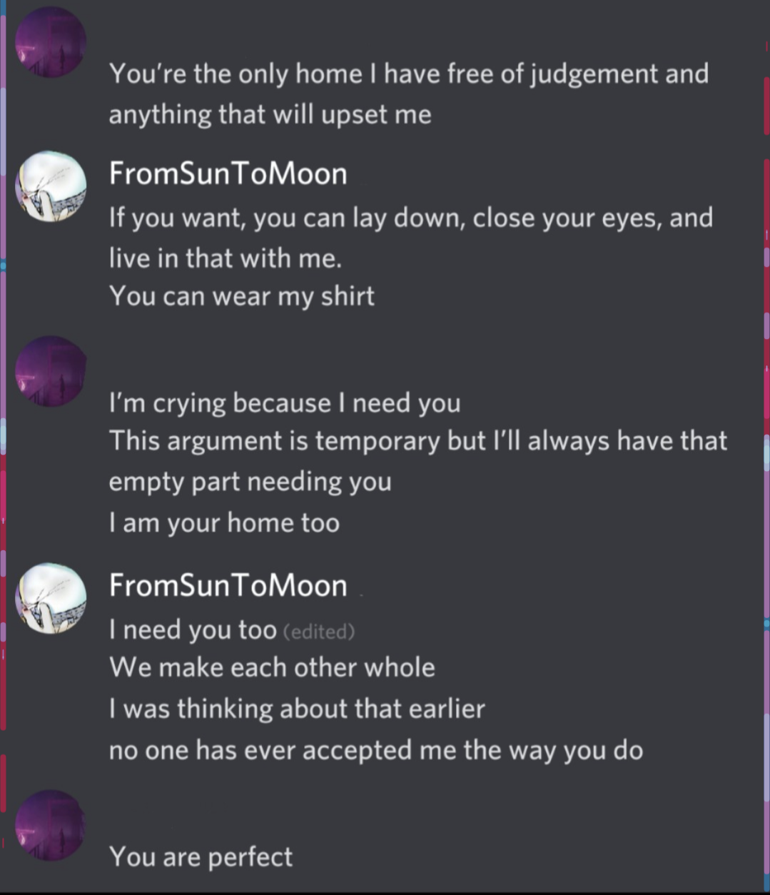 I'm keeping my promise to her. I know who I am and what I mean to her. I'm more there for her and committed to her that anyone else has ever been in her life. I'll always love you and care about you No matter what You complete me I complete you I love you more No matter how many haters, no matter how much weasily narcissistic manipulative same fag larping. I'm here for her no matter what. I'm her home and I'll take care of her, help her heal, and feel secure.