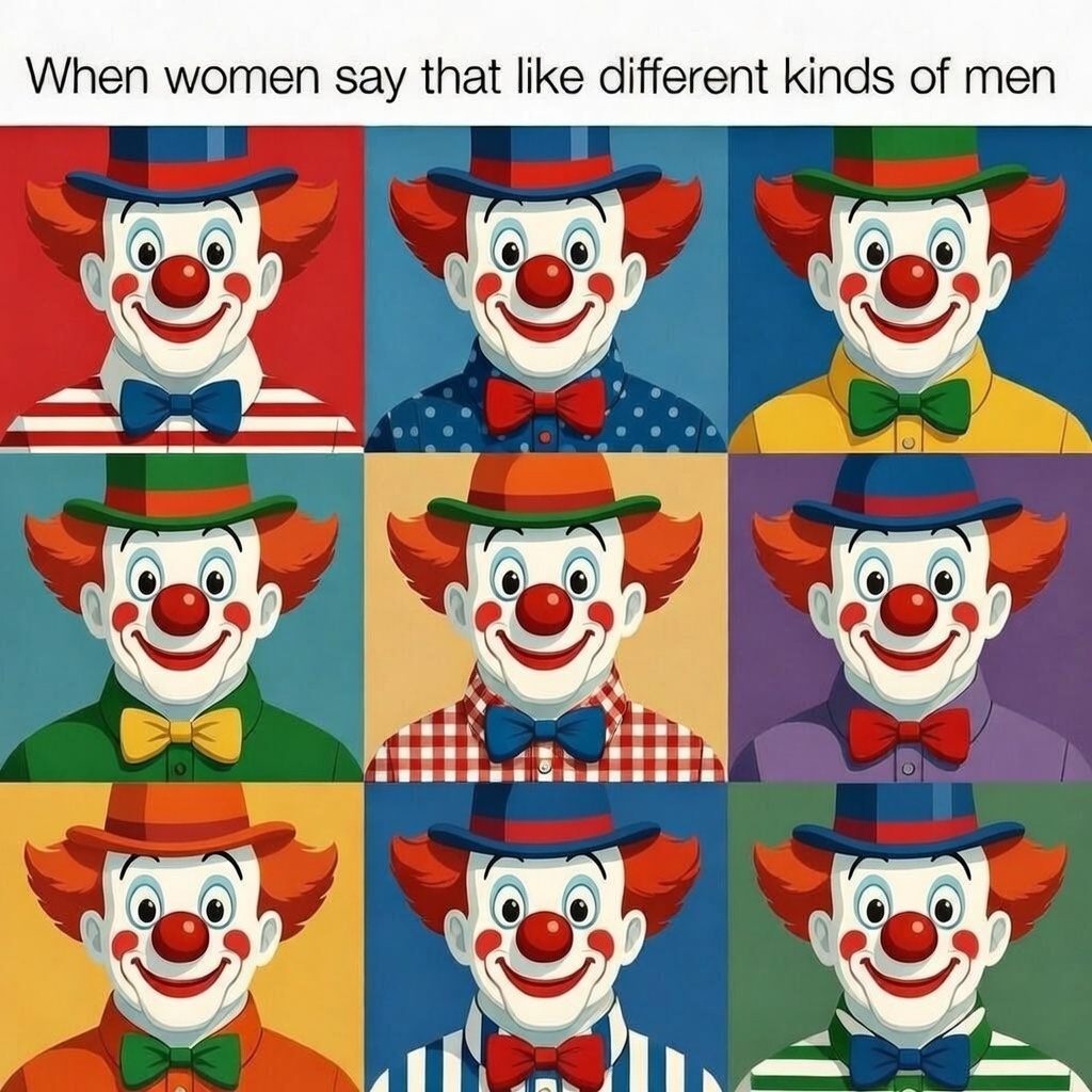 >>83631299Do you guys have the meme that says "when women say they like different kinds of men" followed by pictures of the same Chad man with different clothes/accesories?