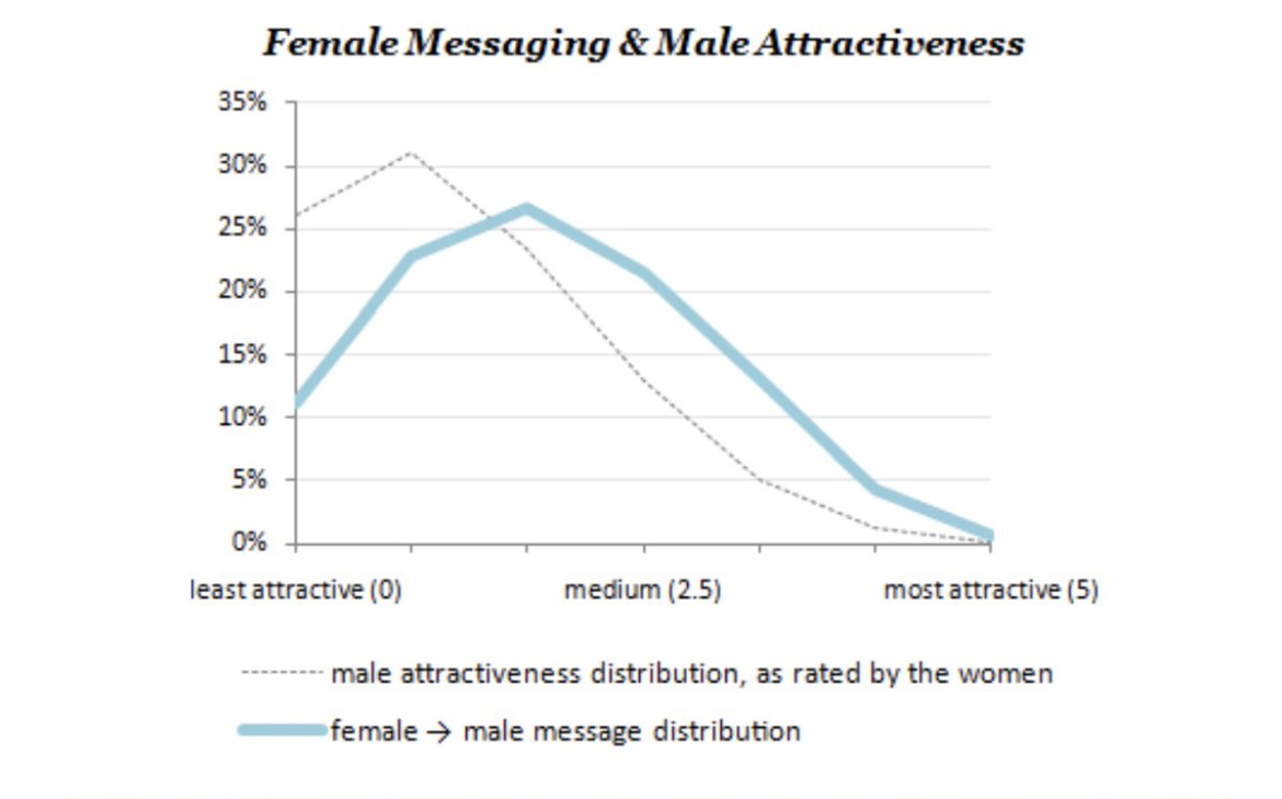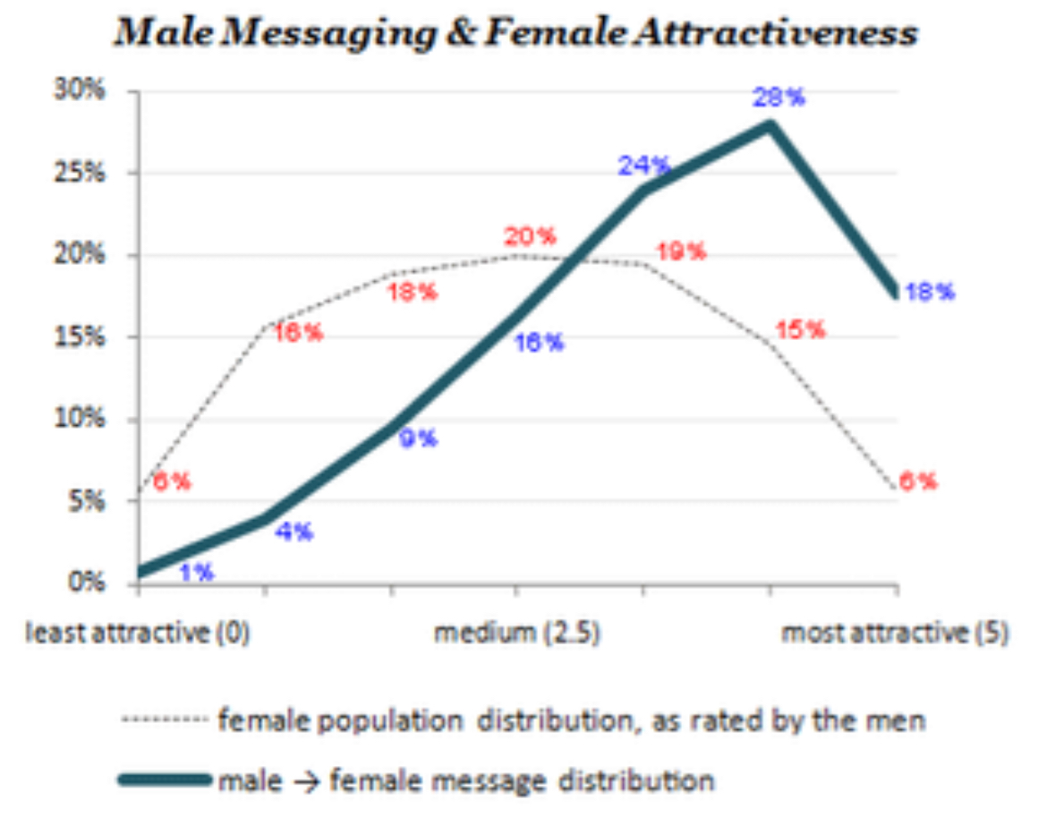 >>83665981>percent distributionNow look at the total number of messages for men and women of the same attractiveness percentile.
