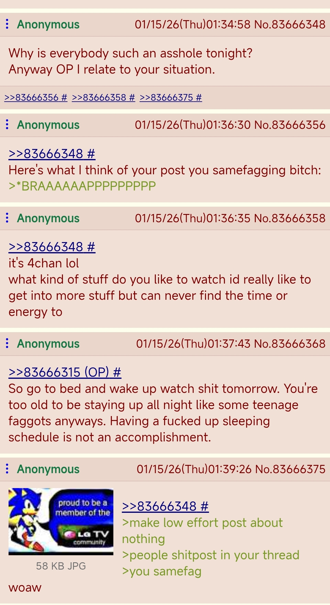 >>83666315>>83666348Honestly, it's deliberate. I noticed it through 2025 and it seems to have kicked up another gear recently. I don't know if it's bots, discord 'activists' or low-paid jeets, but there's been this persistent force of negativity across all boards. Almost any thread, any post, any opinion, if a weakness can be identified or a belief can be attacked, it'll absolutely happen. You'l notice it's always the first replies that do this, actively jumping onto new threads to get in quick.I'm not sure why it's happening, but it is happening. There have been forces pushing demoralisation on 4chan for a really long time now (since around 2017) but they've shifted strategy, going from subtle to outright aggressive.>4chan has always been this wayNo, not quite. It might seem that way to a newfag or a casual observer, but there's a difference. Harsh takedowns and insults have always been commonplace, but they were targeted, not universal. A post like OPs might get a mixed response, most likely mild indifference and a lack of engagement, but just look at the replies. The first one is fine, but the second is ridiculous and the third doesn't even make sense.