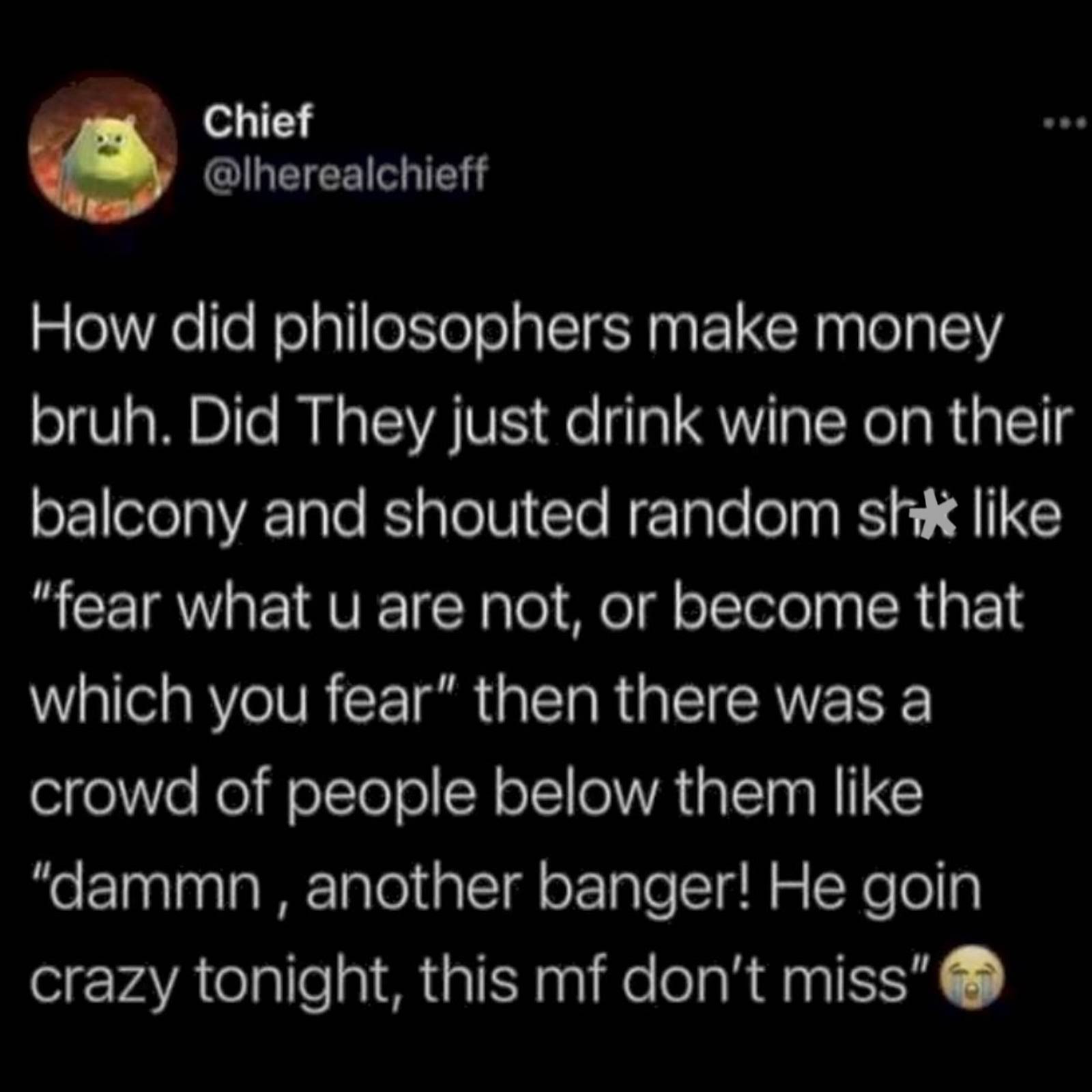 >>83668611This is basically>>83668600Think professors or lecturersPhilosophers were literally just paid to yap and/or writeHell, if we go for modern philosophers like Camus or Mishima, those guys wrote best-selling novelsif we go for renaissance/modern-era guys like Spinoza, guy worked a day jobSome of them were just born into wealth like Kierkigaard, guy could afford to do his thing solely off of his inheritance