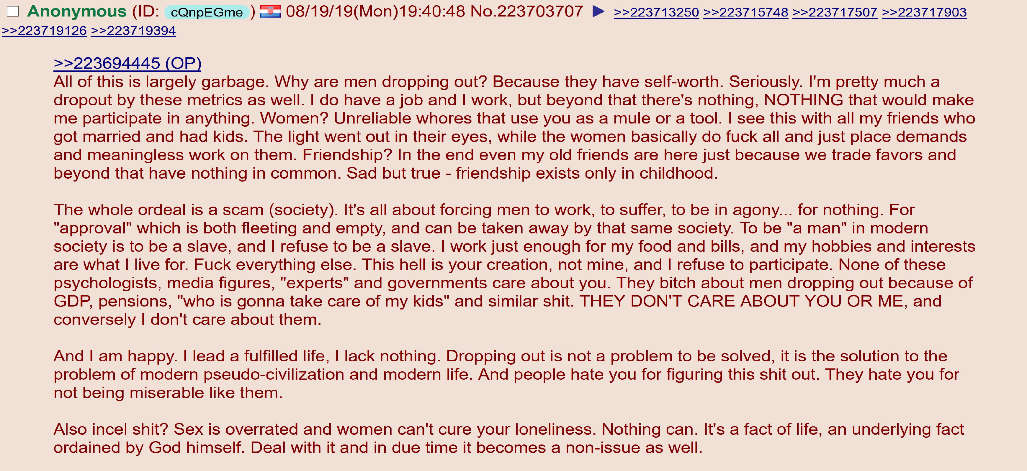 >>83671927>Why are so many men dropping out of society?I haven't, but only because I want to work and build wealth to retire as early as I can afford it.>How can we ensure that these guys step up and get married, have kids and contribute to society?Improve women and make them more loyal. I don't want to marry Chad's 30+ leftovers. Make buying a house and childcare far less expensive, so I don't have to wageslave for 40yrs to pay off a mortgage and spend $100k-300k on raising a child to 18. As it is, I have a choice between retiring early and coping with my hobbies and freedom or being a wageslave till my 70s, living paycheck-to-paycheck, having kids with a non-virgin woman who might cheat on me or divorce rape me. Guess what I'm gonna go for...