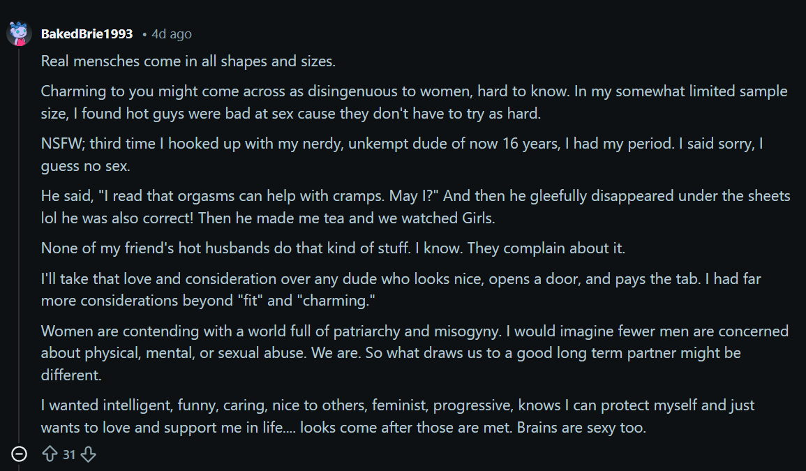 women want intelligent, funny, caring, nice to others, feminist, progressive men