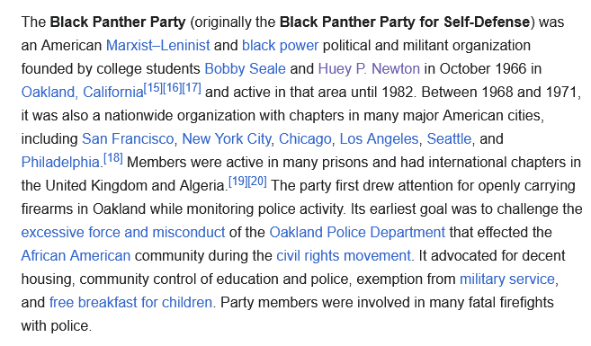 >>83710390>Theyre literally the black version of the kkkthe black panthers are not black supremacists and never were. they literally gave children free breakfast, provided daycare services for single mothers, and had community cookouts that were welcoming of all people(except cops). when did the kkk ever do that?