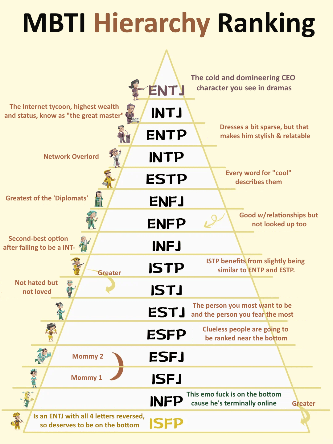 PersonalityDatabase votieng on qualitiese:i fvor the Fi dom Infp4w5 from this lstINFP 4w5 qualities: despresed, suicidal, aithenticc, romantic, idealistic, (mentaly unstable), self-aware,ethreal, miserable, unique, imaginateive, insecurepedophelic : INFJ Narcistic: entj 3a4attractive ooh: enfj 2w3manipulative: also enfj 2w3possesive: also enfj 2w3Hot: ISTP 8w7immaturity : esfp 7w6disorganised (judging): infj 4w5emotionaly deep: infj 4w5mysterious: infj 5w4 schiz*phren*a (-_-) : Intp 5w4cringe: enfp 7w6knowitall: intj 5w6competitive: entj 3w4evil: estp 8w7 (mexican maiming of mbti)wife material: isfj 9w1dark empat(??): enfj 2w3PTSD : infj 5w4 funny (introvert): intp 5w4violent: estp 8w7rude: estp 8w7,,Funny: Entp 7w6Asocial (extrovert): Entp 5w4 (tsendrich this type)cynical : intj 5w6resentful: info 4w5rare: intj 4w5nihilistic : intp 5w4mdangerous: estp 8w7 ,, deceptive: entp 3w2powerhunger: entj 8w7unpredictable: entp 7w8