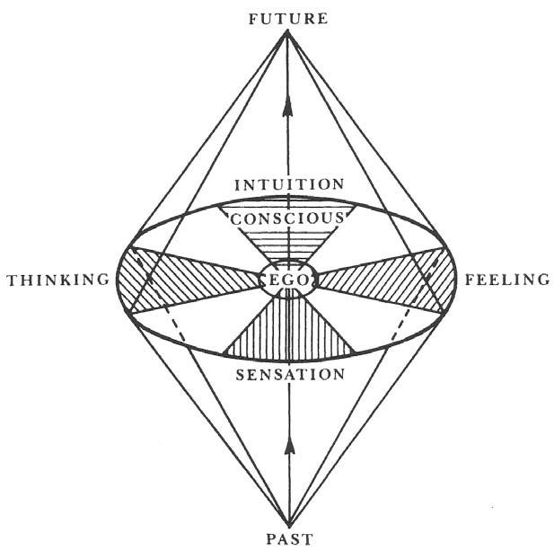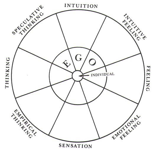 >>83716667There is a brief explanation about it>Diagram 5 is of an ideal condition which we never meet in reality, that is, it presupposes a complete consciousness of all the functions. Therefore I have represented the functions on one plane. In the center is a virtual nucleus i call the self, which represents the totality or sum of the conscious and unconscious processes.>This is in contradistinction to the ego or partial self, which is not conceived of as being in contact with the unconscious elements of the psychological processes.