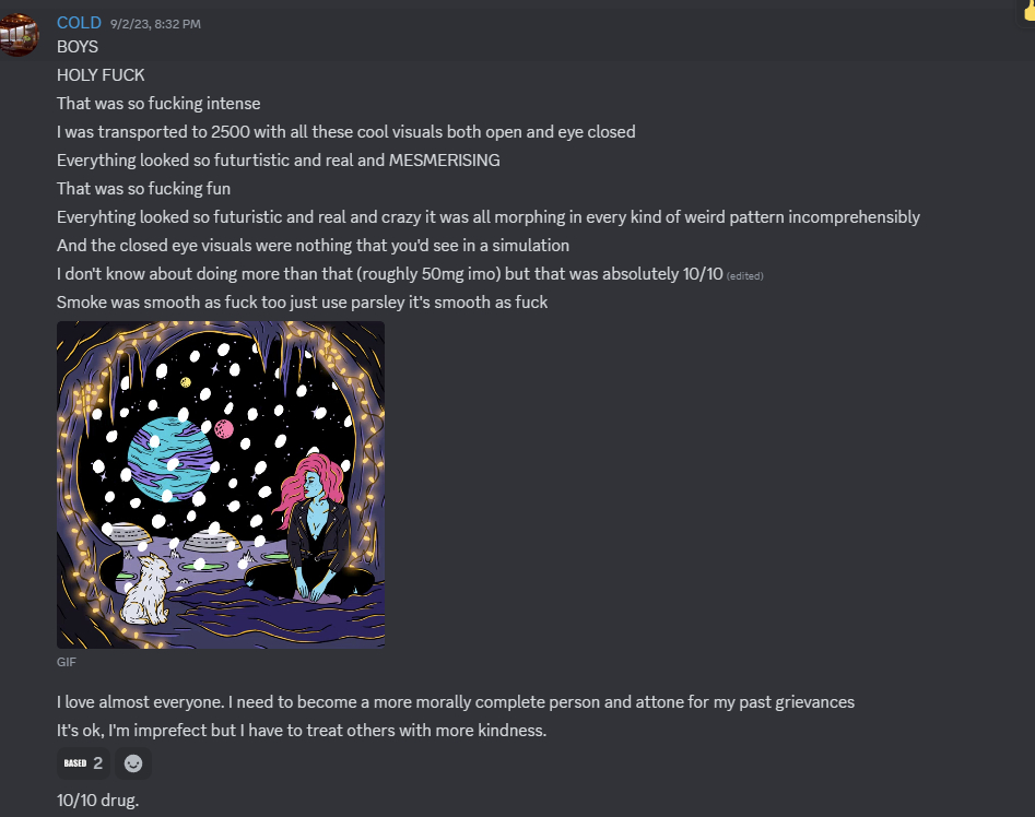 Also, in other places for drugs I talked to people who ODed on it and almost died and described it as a few seconds of bliss and then just peaceful darkness. So someone is lying here and I'm confused.