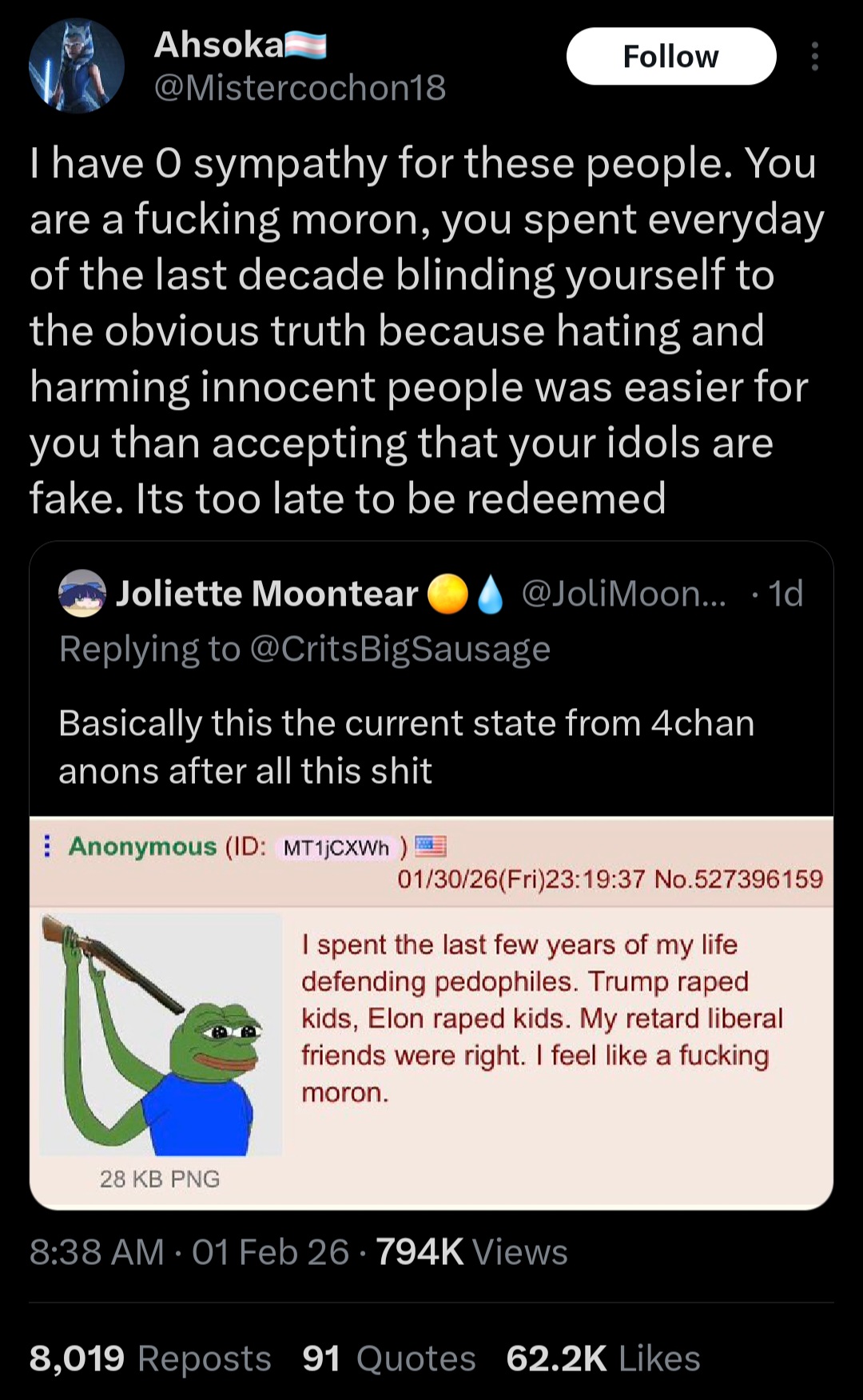 >>83818554>make post on 4chan>repost it on Twitter>easy engagement bait for people who agree with the postElon was retarded for offering money to people who do this. Whether it's jeets, trannies or whatever else nothing good came out of paying people to say retarded shit. I assume it's because circulated posts get ads to more people so it helps his revenue, still dumb though.