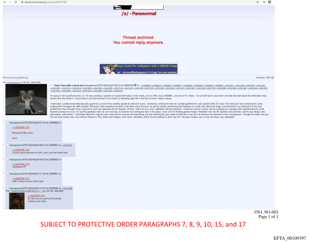 >>83838559Well guys, I ended up looking up that thread in an archive. OP goes on to talk about working for Epstein and being hired out to the Romney family as well as Rhianna. Helped procure underage boys and girls and picked up drugs. Helped bury bodies and put some guy in a wood chipper. And a bunch of other shit. Also Ghislain Maxwell was arrested the day after it was posted. Idk if it's true but the fact Ghislain Maxwell was arrested the day after and the thread is in the files, would lead me to think it might be. Crazy shit. https://archive.4plebs.org/x/thread/25409798/#25409798