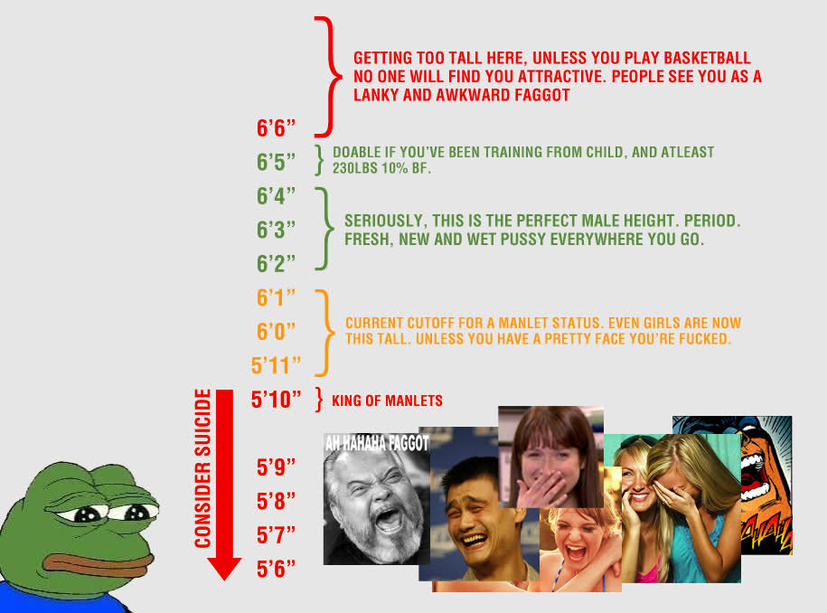 >>83844635This is unfortunately not a good infographic. You will look impressive at 6f5" and 6f6" even if you casually workout and stay in shape. 6'5"- 6f'6" should be the perfect male height tier, anything else is just the purest of copes. No one is really impressed by some 6'3" semi-manlet.
