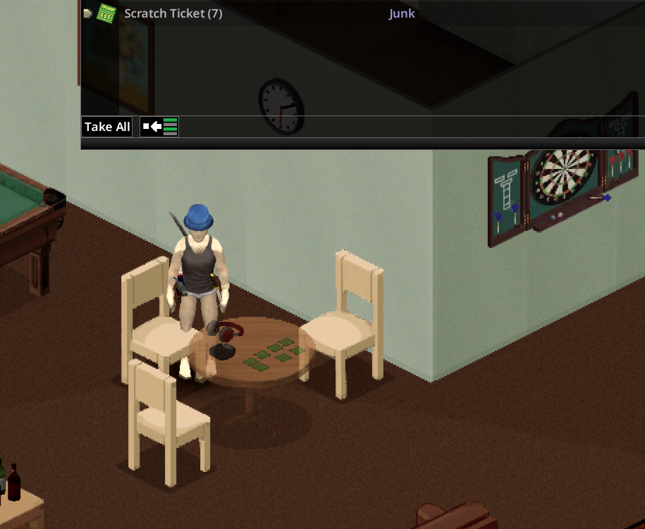 SeasideZOMBOID update.Bokkles bloody galore! His recent forays into the abandoned businesses of the Crackapocalypse have proven very fruitful. He loaded up with enough gin, whisky, rum, vermouth, wine, beer, ale, vodka and alcopops. Finding a pallet of soft drinks has also filled his food full of cupboards with pop and that is double lush.Encountering a house with a gun cabinet has been a blessing from heaven. 3 shotguns and one semi-automatic rifle. The barrels on those shotguns getting sawn off as soon as possible; need to run light when there's crackheads all over the place. There's now a 3% chance that any crackhead could sprint and rush Mark rather than shamble in swarms.Today he's taking a day off and enjoying some of his snacks. Nice bit of banana pudding with cream and pistachios for him if that's alright with you? It's dangerous out there but now I'm on my sixth SeasideMARK I've started to know when to stay away from threats and how to manage them.