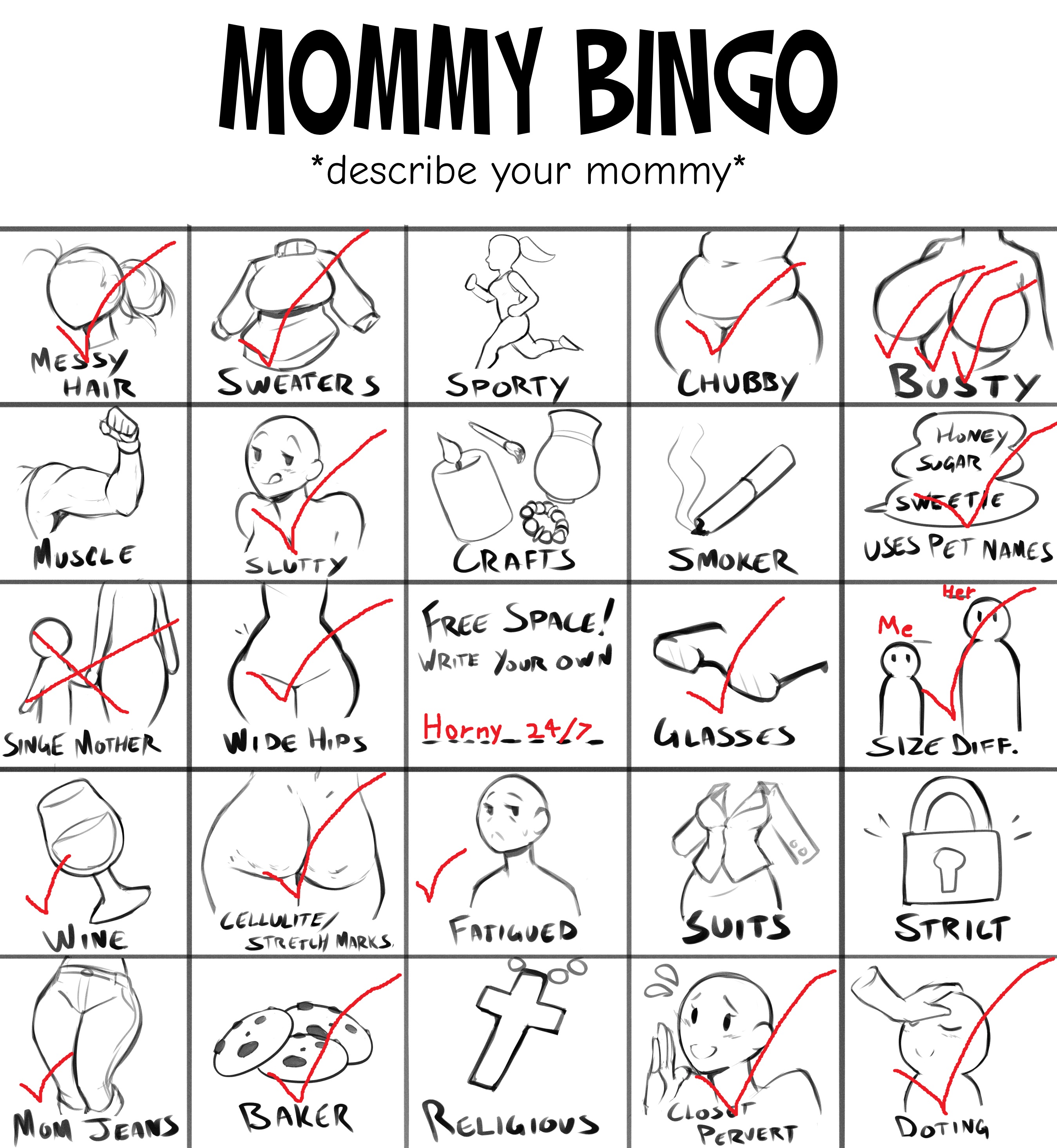 >>83941551>Could you expand on your childhood with her? I was the result of a short fling with a guy who took off as soon as she found out she was pregnant. I dont think she ever wanted to have a kid. She never seemed like the type of person who had any idea how to take care of herself on her own, at least not "well". I dont think she was ever diagnosed with anything but i suspect now she might have had bipolar and maybe aspergers. She was very awkward and nervy and always up and down from soft and gentle and miserable and crying.She wasnt a bad mom. She loved me, but didnt say it much. She wasnt a big talker, house was always very quiet. She always made sure i was fed, but there was never proper "meal times", just whenever she remembered, i guess. She got our house from our grandparents when they passed, and made okay enough money at her job to make sure i never did without. House was always in disarray. We never had guests.>Were you always very close with her? Not really. She never really knew what to do with me when i was little. She didnt neglect me, but there wasnt a lot of kisses or hugs. She would take me to the park, but then just sit on the bench the whole time and not say anything. Take me to the fair and just walk me from ride to ride. Kinda always felt like she was just copying what she saw other parents did. We would watch movies together in the evening and thats usually when she would talk the most, pointing out stuff to me. She breastfed me until i was seven or eight or something like that, and it only stopped because i found out that it wasnt typical somehow and asked to stop. I dont remember it being a big deal to her.>Also could you fill out this chart?Attached it on the side. Small checks are "kind-ofs", examples being that she was heavier, but not as chubby as the example, and she wore "mom jeans" sometimes, but more often sweatpants.>>83943112H, but tits more like G. They were huge, especially because she was really short, 4'10 or 4'11.