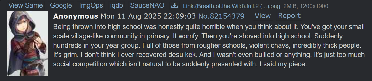 Ngl I wish I could relive primary school again. Was womfy af. Secondary school can fuck right off though. Them years fucked me up.