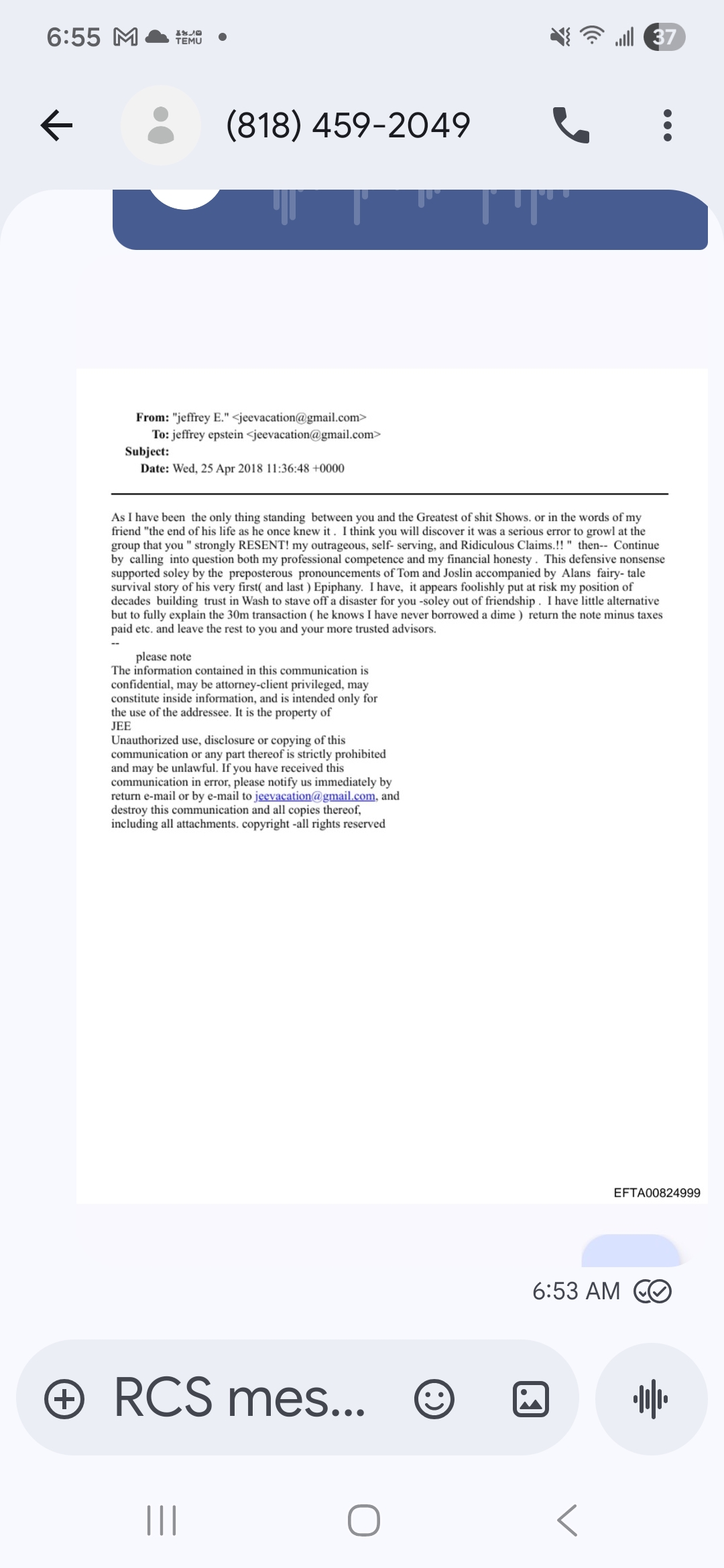 >As i have been the one thing standing between you & the greatest of say shows or as my friend said "the end of his life as he once knew it". i think you will discover it was a serious error to growl at the group by calling into question both my professional competence & financial honesty. This defensive non-sense supported soley by the preposterious Pronouncements of Tom & Joslin accompanied by Alan's fairy tale of his first (& last) Epiphany. i have, it appears, foolishly put at risk my position of decades building in Washington in order to stave off disaster for you- soley out of friendship. i have little alternative but to fully explain the 30 million dollar transaction (he knows i never borrowed a dime) return the note minus taxes paid, etc. and leave the rest to you & your more trusted advisors.