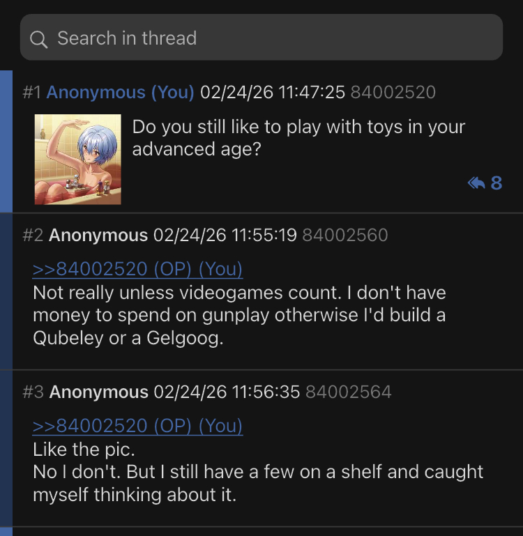 >>84002520Like the pic.No I don't. But I still have a few on a shelf and caught myself thinking about it.