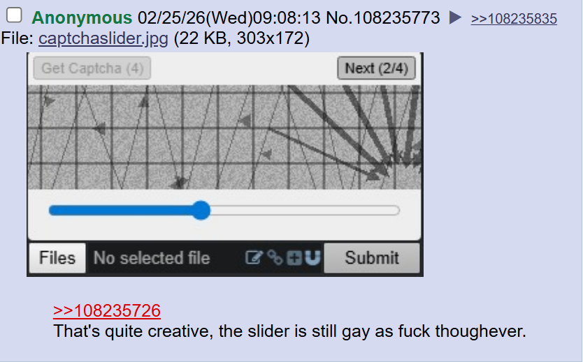 >jannies need to do college textbook level captchas to filter third worlders and spammersGrim