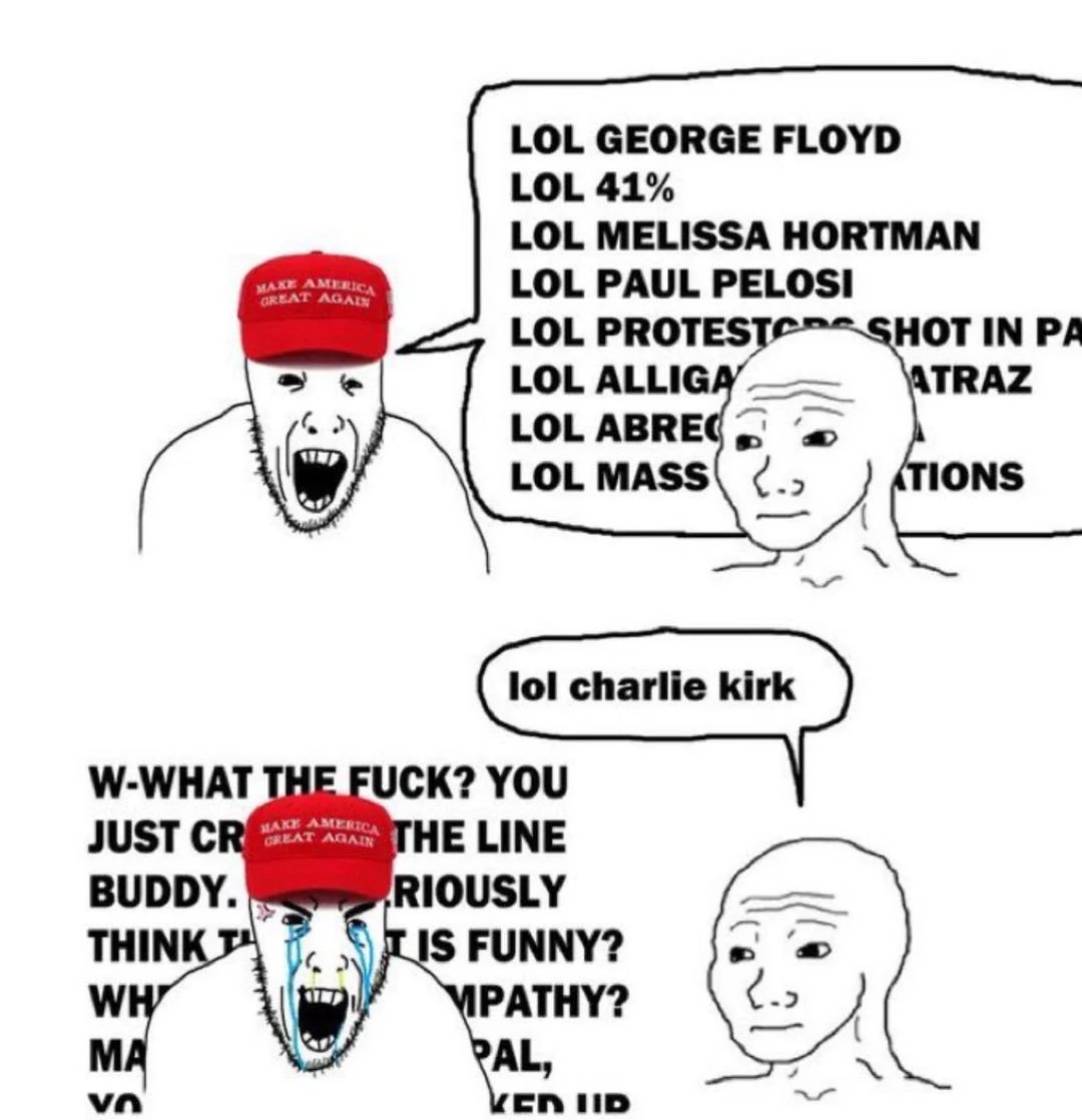 >>84010263People were ready to share some Fs and move on but miggers decided to be retarded and sperg out over the small minority of edgy teens so now Charlie Kirk is the right-wing version of George FloydGeorge was a drugged out nigger criminal who died of overdose, Charlie was a sociopathic weasel who got his ass whooped in actual political debates, both are fun to mock