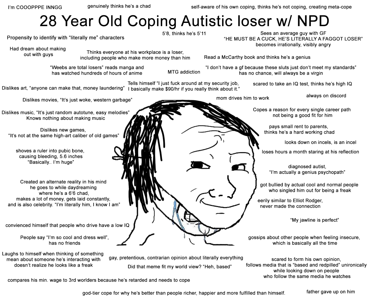 >>84013911>How do NEETs not experience an existential dread knowing damn well once their gravy train runs out they're going to be homeless with no one to mooch from anymore?I have a revolver in a safe deposit box. I learned that from a Family Guy episode. >No resume or job experienceYeah but they wouldn't hire me anyway >Completely dependent on someone else to provide shelter, food, and basic necessitiesIt's okay, it was like this when I was a kid>Has the audacity to bite the very hand which clothes and feeds them...I don't fight with my parents, like at all, they're very supportive >Views wagies as something lesser than him and is insulted when told to find a jobDo you have a job for me?>Somehow possesses an ego to not be a wagecuck but not enough of an ego to shit his own pants to declare himself mentally disabled during an interview for NEETbux.Wouldn't that take an excessive ego to get on NEETbux if you don't need it? I don't want to be part of the problem >Must be nice being a parasite but unless you latch on to your next host you can forget about having the luxury of playing video games all day and ordering warm meals brought to you by the wagie you put down and gleefully taunt.You're talking like it was my decision for the world to be like this.