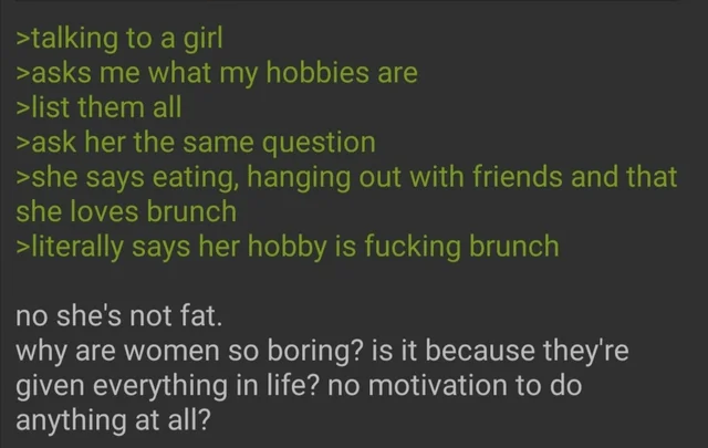 >>84021506>foid cant comprehend camaraderie>foid constatly treats sex as a magical thing but also as not a big deal in the same breathwomen have smaller brains