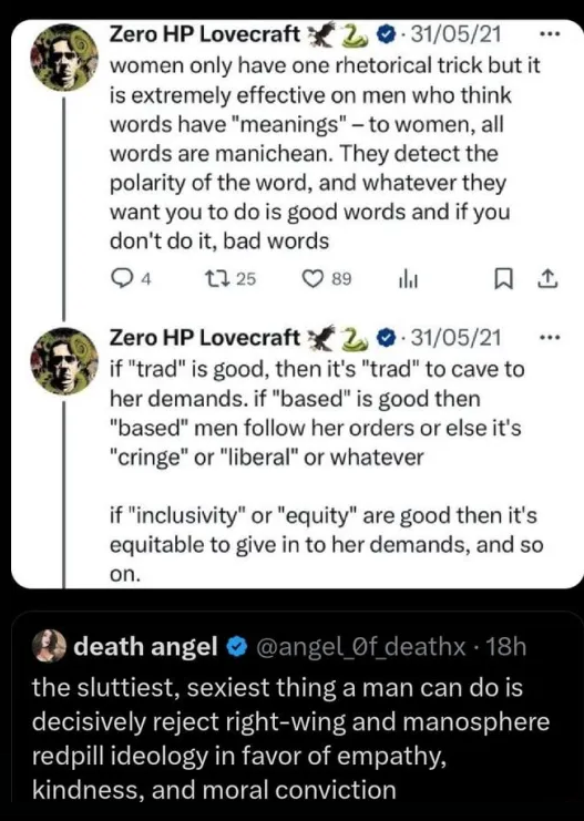 >>84021560imagine believing true love exists in the same universe where romance isn't a universal gift, which is quite literally because of foids mind you>picreli can tell youre some cunt because this did not refute my original claim. nothing you say thats "right wing" holds any weight because youre a woman.