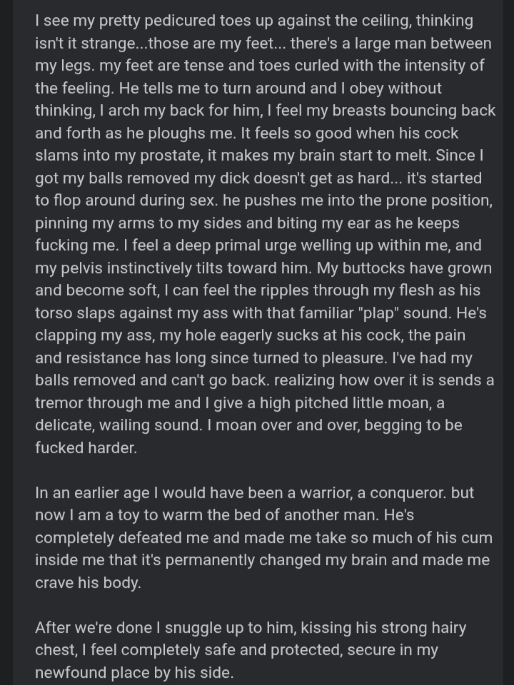 The hottest part to me is how badly you want this kinda treatment, that you were born male but now you're impossibly horny spreading your ass for me and feeling your masculinity drowning in my seed, your deepest desire to be taken, mounted and fertilized like a bitch in heat