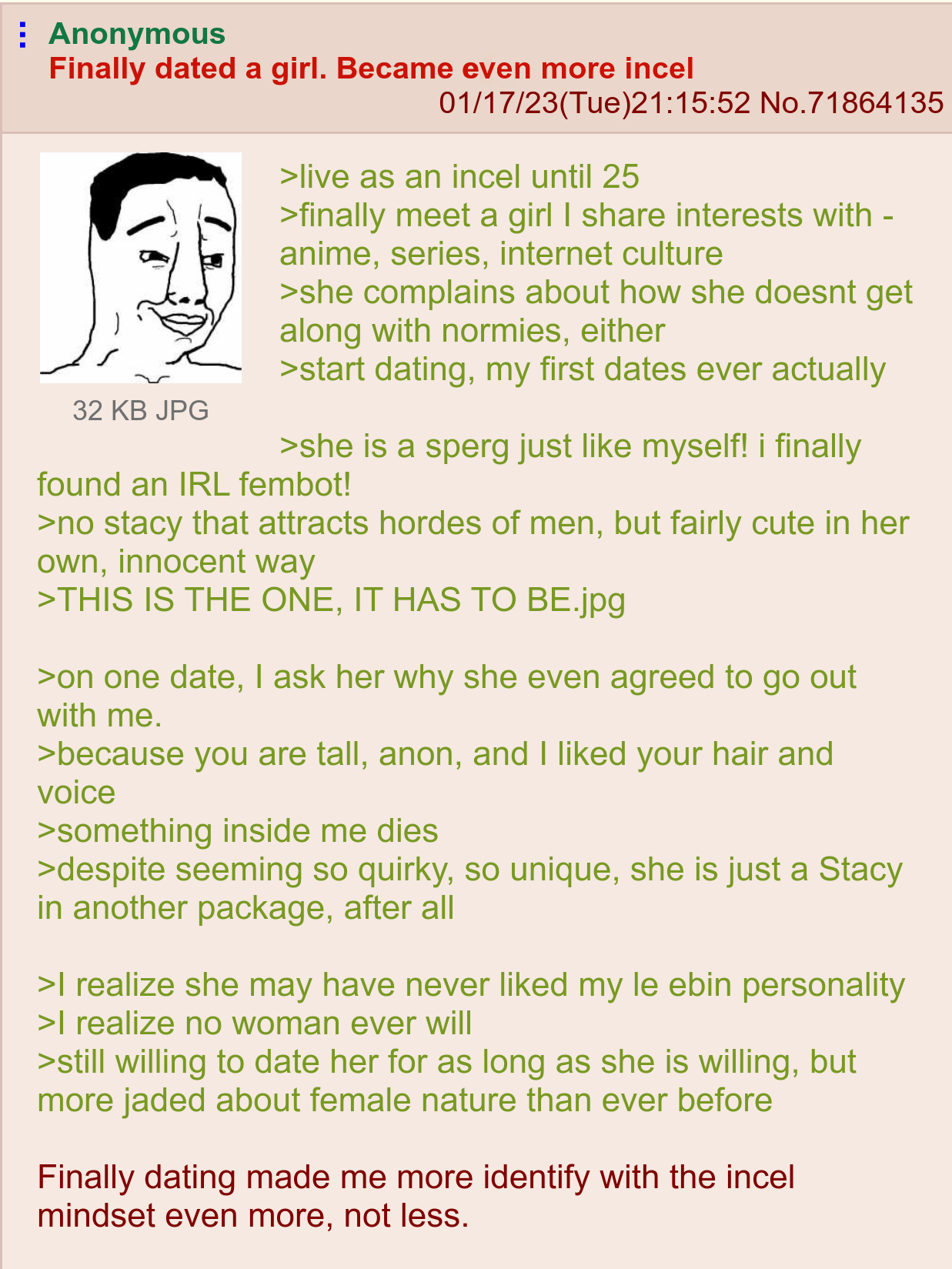 >>84089023That anon was not an incel. He was a chadlite mentalcel, as proven by the fact that a foid was physically attracted to him.