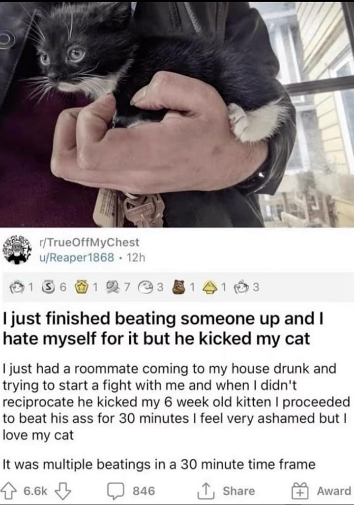 >>84154564>take a picture of a random kitten>make up a story where they're hero beating up bad people>post on reddit>get tons of updoots, medals and praisefake bullshit. chatgpt could write a better story>roommate>my house