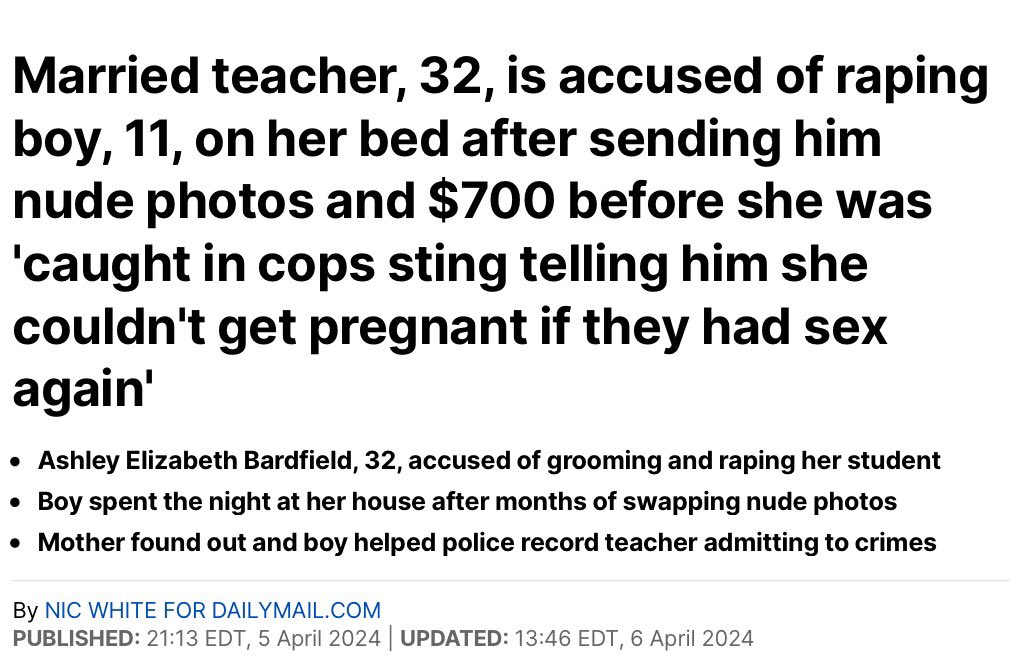 >>84162008>11>Dear Lord... Granted, pedophilia is not exclusive to women, but why are there so many female teacher pedos coming out the woodworks lately?
