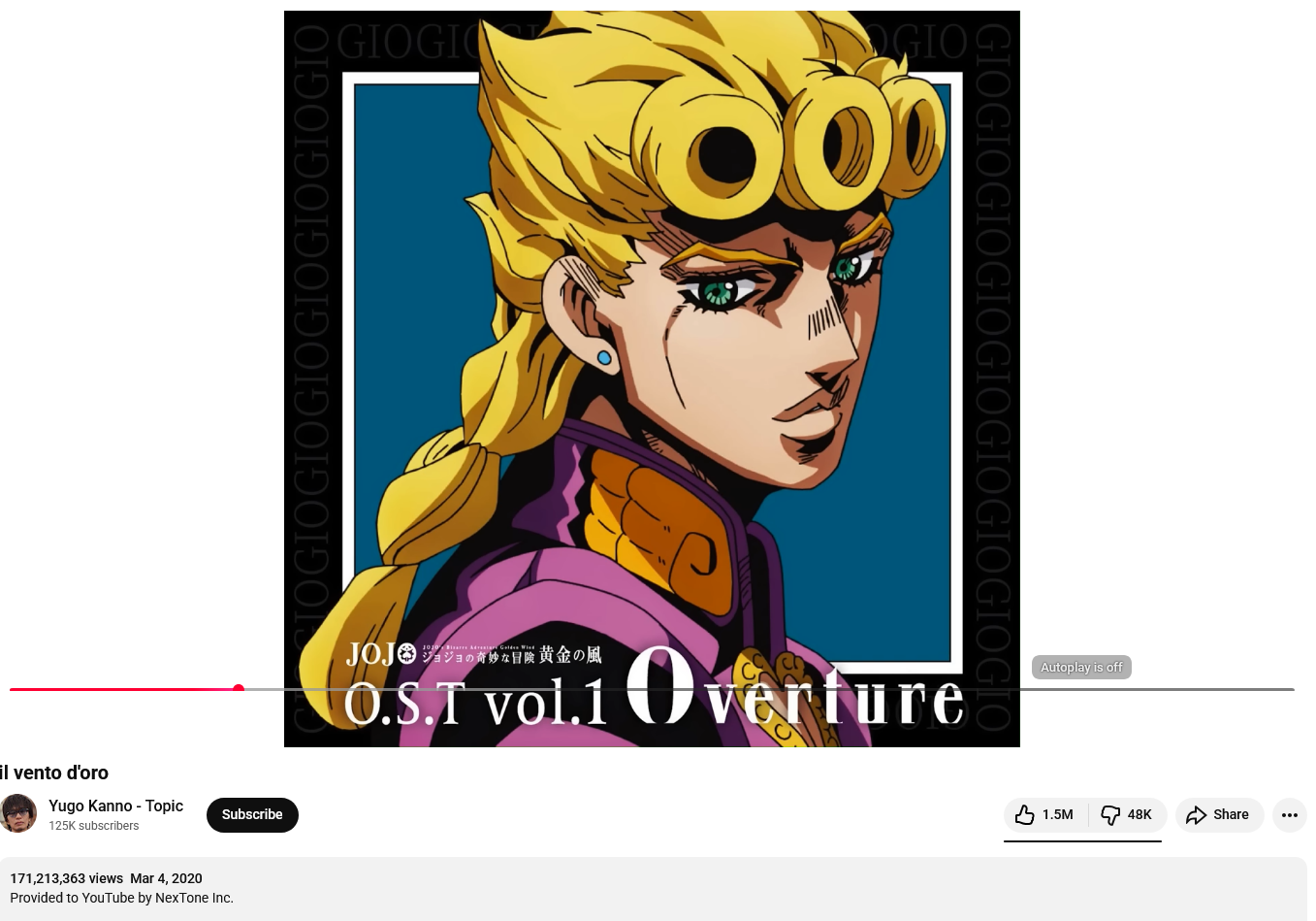 >>84163118I really like this song. I've seen all the seasons of Jojo. I think Golden Wind and Battle Tendency were my favorites.