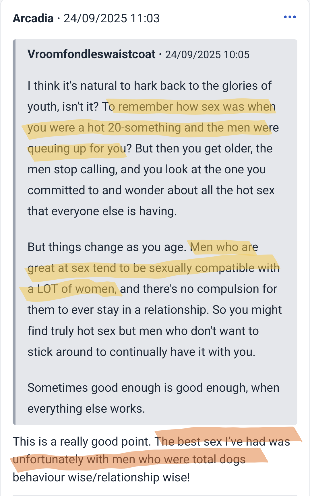 all I'm seeing are a lot of wives and mums agreeing that having kids with the man they love and raising them well together is more important than just good sex.Keyed mums dabbing on incels and porncels who think that orgasming and making others orgasm is the most important things in life.