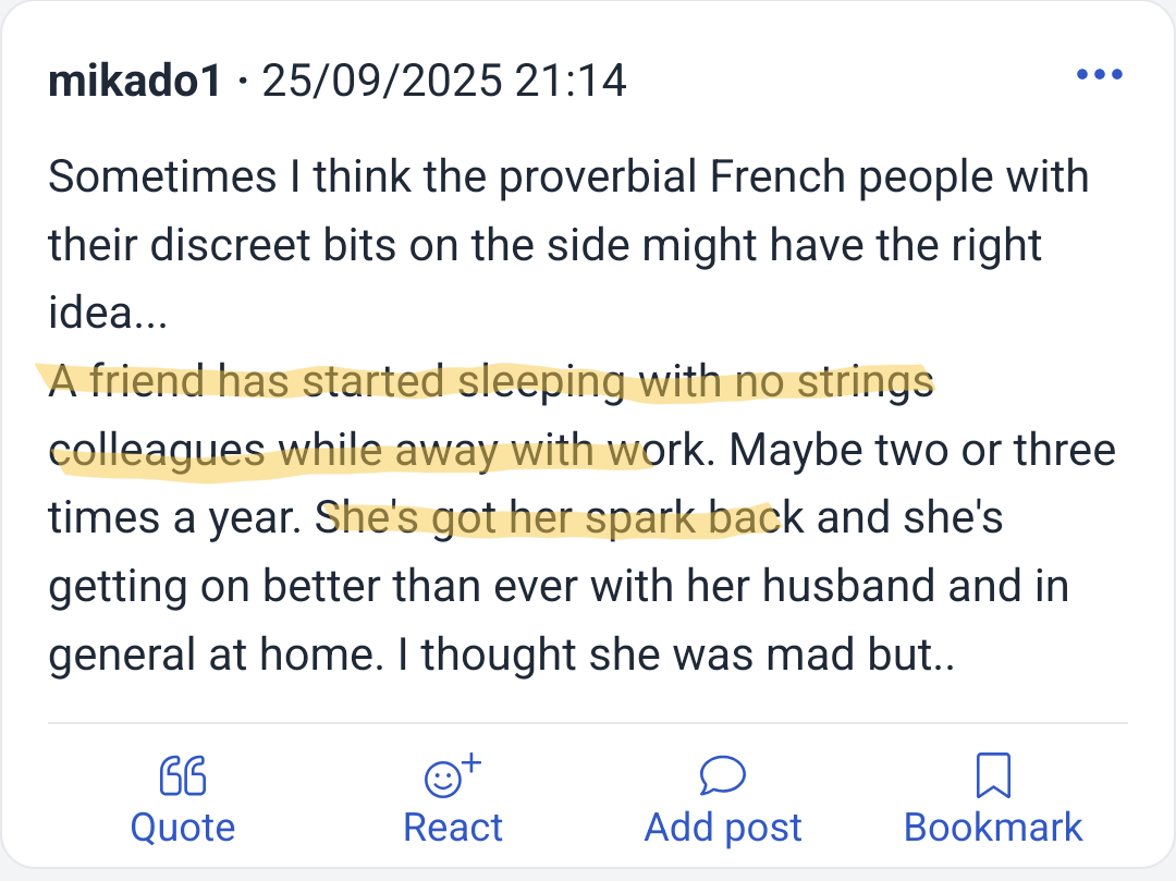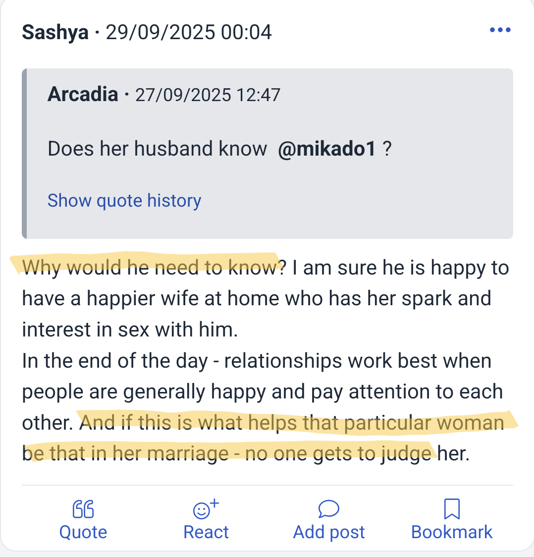 >>84212676Women know what it means. Lmao> I don't WANT to cheat on my husband, but...