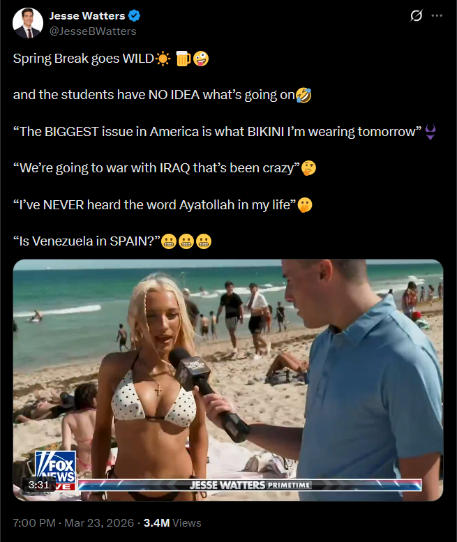 Wow a bunch of young sexed up college students enjoying a beach vacation don't give a shit about the eternal grind of bullshit international affairs, they must be so stupid.