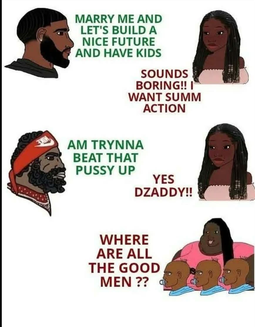 Black women are based as fuck for not luring black men down the same path white men took. I mean whites are fucked. We are the most cucked men in history. However, look at our ancestors. They were niggers before niggers. They were hard as fuck. Straight killers. They took what they wanted from this world. They fucked this world dry and never apologized to anyone. Now look at their cucked out "educated, hard working" decedents. Nah, nigger bro, the sheboon has it right. Believe her base animalistic intuitions.