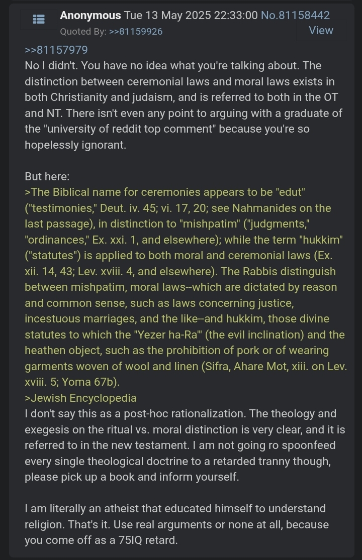 >>84234664When critiquing a religion, you must do so within the framework of that religion. Pic related is from another "debate" I had explaining to some retard the difference between ceremonial and moral law. Within the Christian religion (i.e., within its framework), the Jesus figure comes to explain that the Jews placed the oral (Talmud, for example) and ceremonial laws (Shellfish, etc) above the moral law, and came himself to abolish the ceremonial. Even within the Jewish religion, there is a distinction between "unclean acts" which are not "morally" wrong but are instead violations of the covenant to distinguish the Israelites from the gentiles. These are things like shellfish, pork, and the prohibition on wearing cloths made of mixed fabrics. How is this known? Because Jesus himself comes to say>Matthew 5:17 Do not think that I have come to abolish the Law or the Prophets; I have not come to abolish them but to fulfill them.And then promptly breaks the ceremonial laws (working on the Sabbath, for instance) several times, explaining that the ceremony is meant to serve man and not the man the ceremony. "Oh!" you say, working on the Sabbath was a violation of the Ten Commandments! But this is not so, as the text is not at conflict with Jesus' interpretation, namely, that the Sabbath was not a prohibition on all activities (like turning on a light switch in halakha).What about the episode with the adulterer permitting adultery:>John 8:10 When Jesus had lifted up himself, and saw none but the woman, he said unto her, Woman, where are those thine accusers? hath no man condemned thee?Yet it does not, as this proceeds right after:>She said, No man, Lord. And Jesus said unto her, Neither do I condemn thee: go, and sin no more.And the moral imperative to enact the law is expounded upon here:>if thou do that which is evil, be afraid; for he beareth not the sword in vain: for he is the minister of God, a revenger to execute wrath upon him that doeth evil.