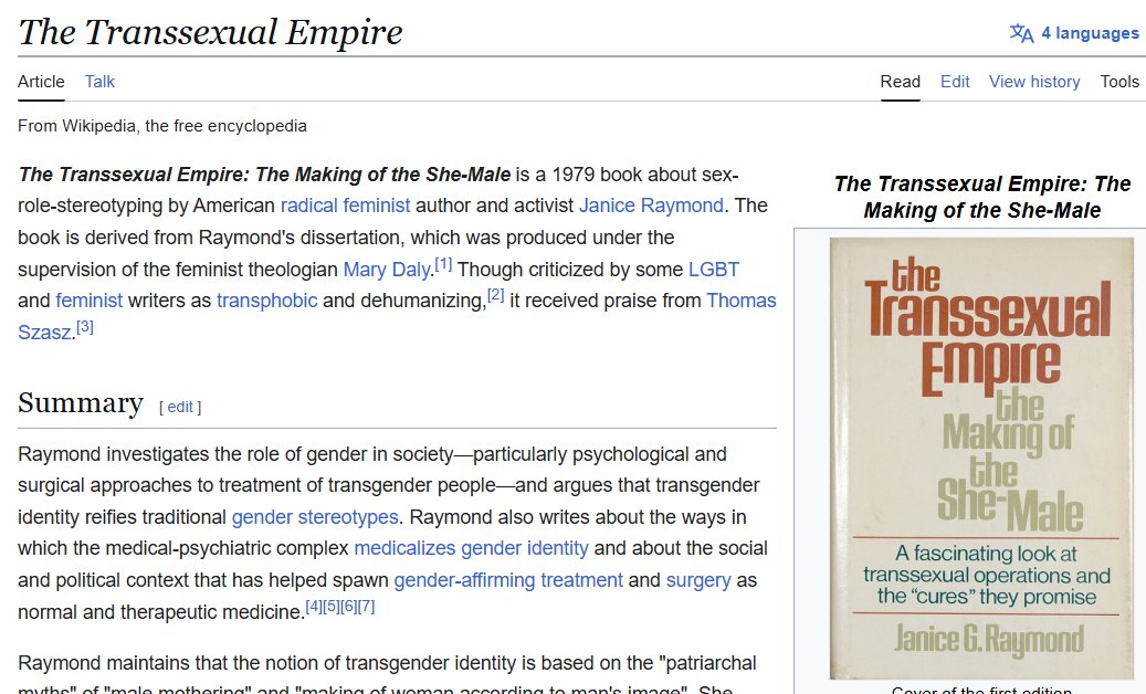 >>84234135Here's the wikipedia page of "Transsexual Empire - Making of the She-Male".Back then hardly anyone was transsexual. Since the book was published there's been an ever increasing amount of Trannies. The book was written by a feminist. This feminist claims to be a TERF yet her book reads like a manual on how to raise a child which later in life becomes a tranny.And back in 1979 transsexuality was such a rare phenomena that it wasn't justified to talk about an "empire".