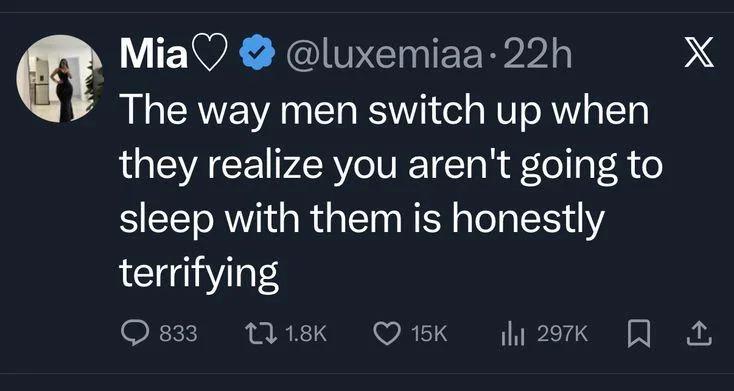 What's terrifying is women actually have the bloated egos necessary to believe men are being good faith in the first place